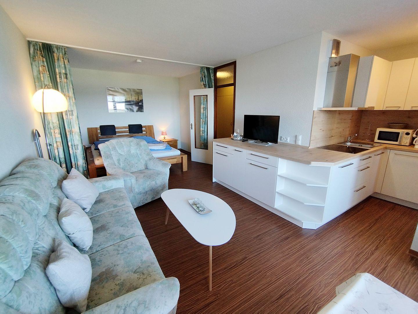 Wohnbereich mit einer 3er Couch und Sessel sowie Flachbildschirm-TV.
