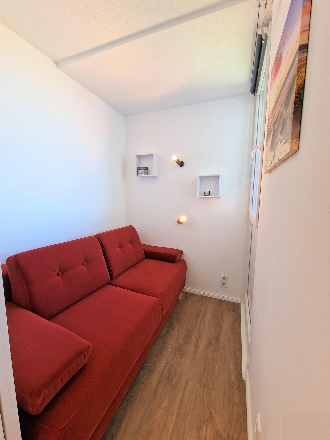 Der Wohnbereich ist mit einem eleganten Vinyl-Designboden ausgestattet und bietet eine komfortable, rote Eckcouch sowie einen großen Curved-TV mit DVD- und Blu-ray-Player – perfekt für entspannte Stunden oder gemeinsame Abende. Der Essbereich am Fenster lädt dazu ein, gemütlich zu frühstücken oder den Tag bei einem Dinner ausklingen zu lassen. Die Küche ist modern und komplett ausgestattet: Ceranfeld, Backofen, Spülmaschine, Mikrowelle, Kaffeemaschine und alle wichtigen Utensilien stehen bereit, um das Kochen zum Vergnügen zu machen.