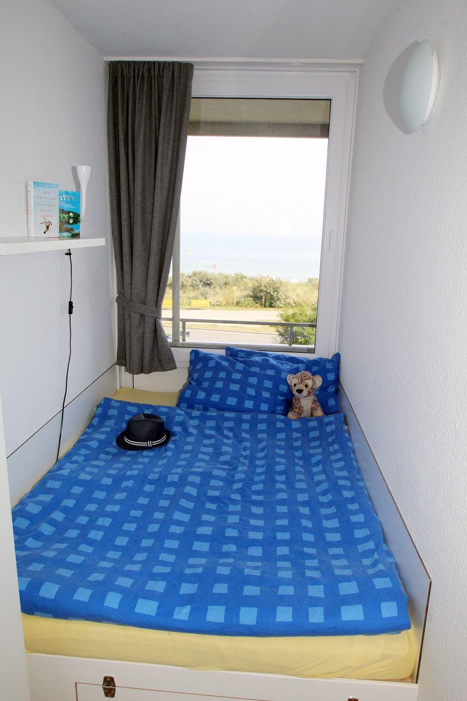 Separates Kinderzimmer mit kleinem Doppelbett und direktem Ostseeblick.