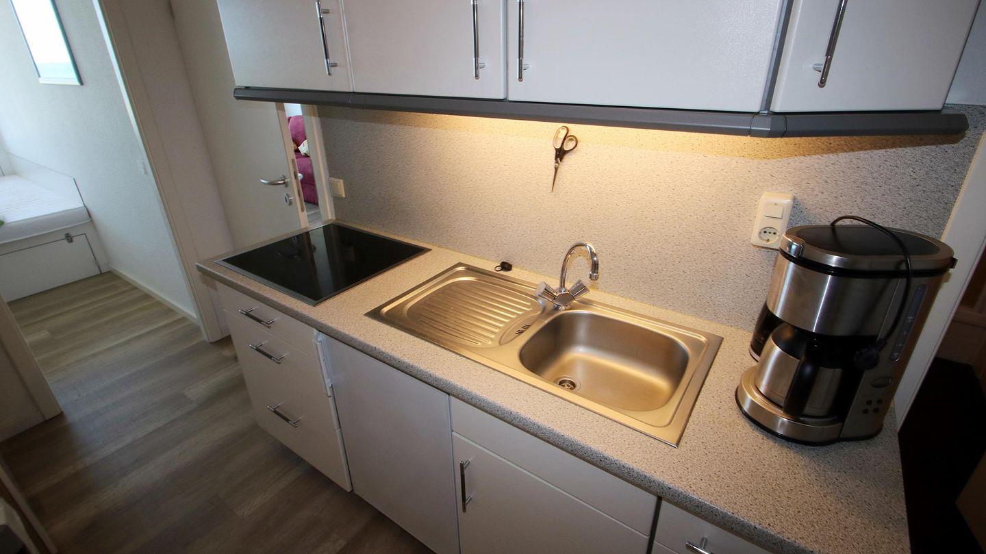 Die Küchenzeile verfügt über ein Ceranfeld, Kühlschrank und eine Kaffeemaschine.
