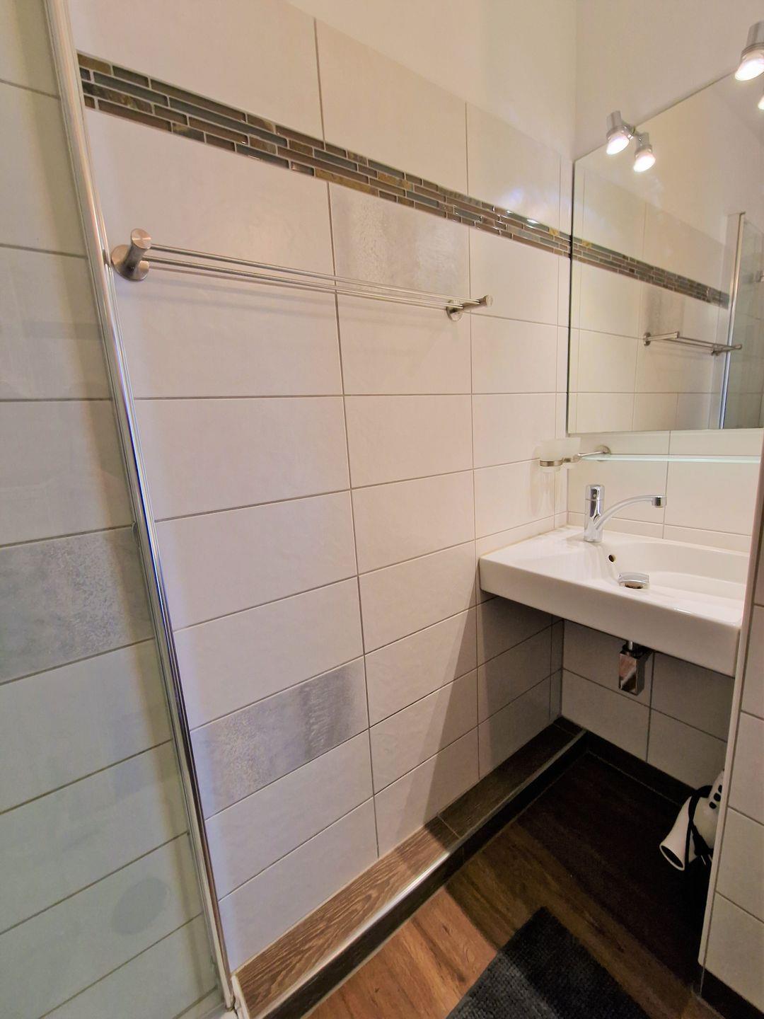 Auf das moderne Badezimmer gehen Sie direkt drauf zu. Dieses ist mit einem WC sowie einer Dusche (Duschkabine, hoher Einstieg) ausgestattet.