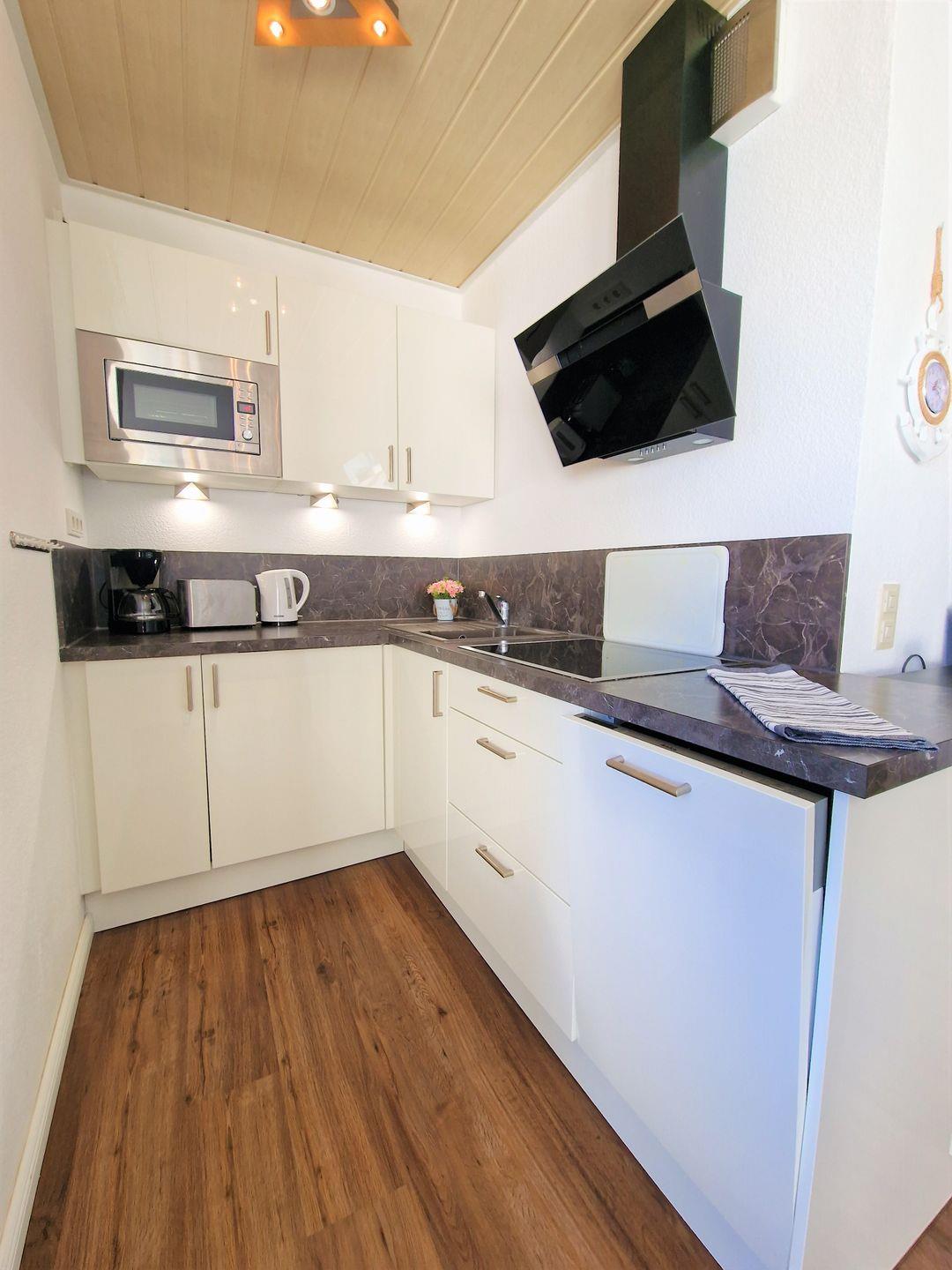 Die tolle, offene Einbauküche vom Wohnbereich aus, ist hochwertig ausgestattet: Ceranfeld, Geschirrspüler, Kaffeemaschine sowie Nespresso-Kapselmaschine.