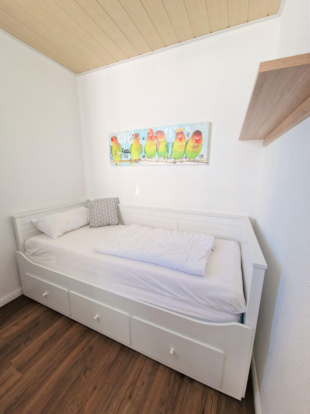 Das separate Kinderzimmer (mit Tür vom Wohnbereich getrennt) ist mit einem Ausziehbett für 2 Kinder ( je 90*200) eingerichtet.