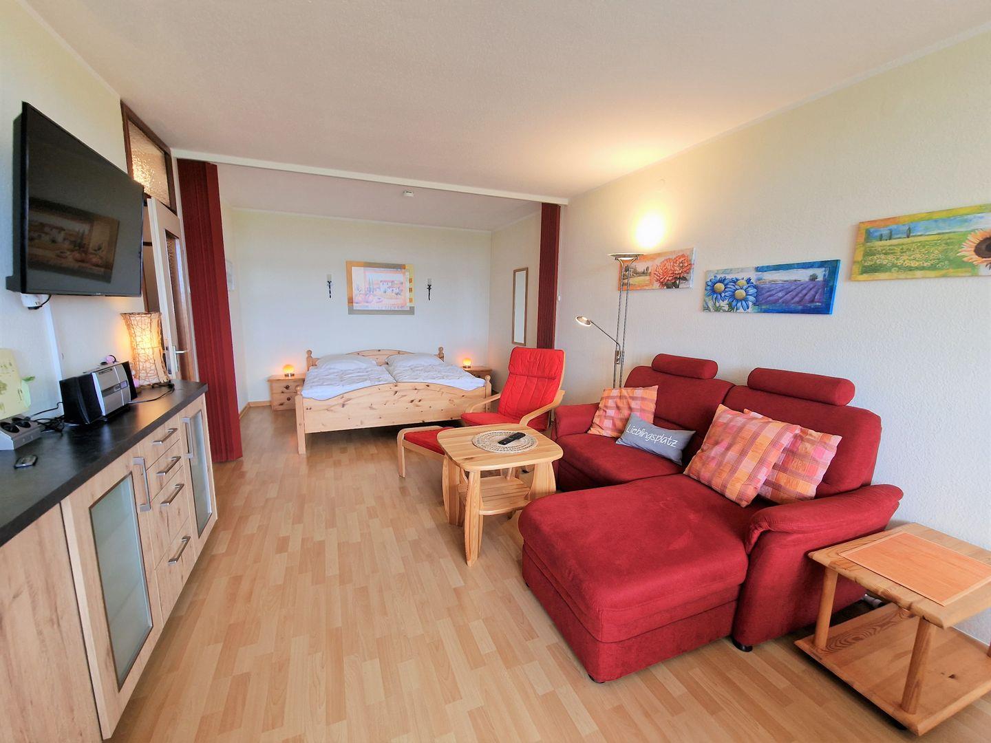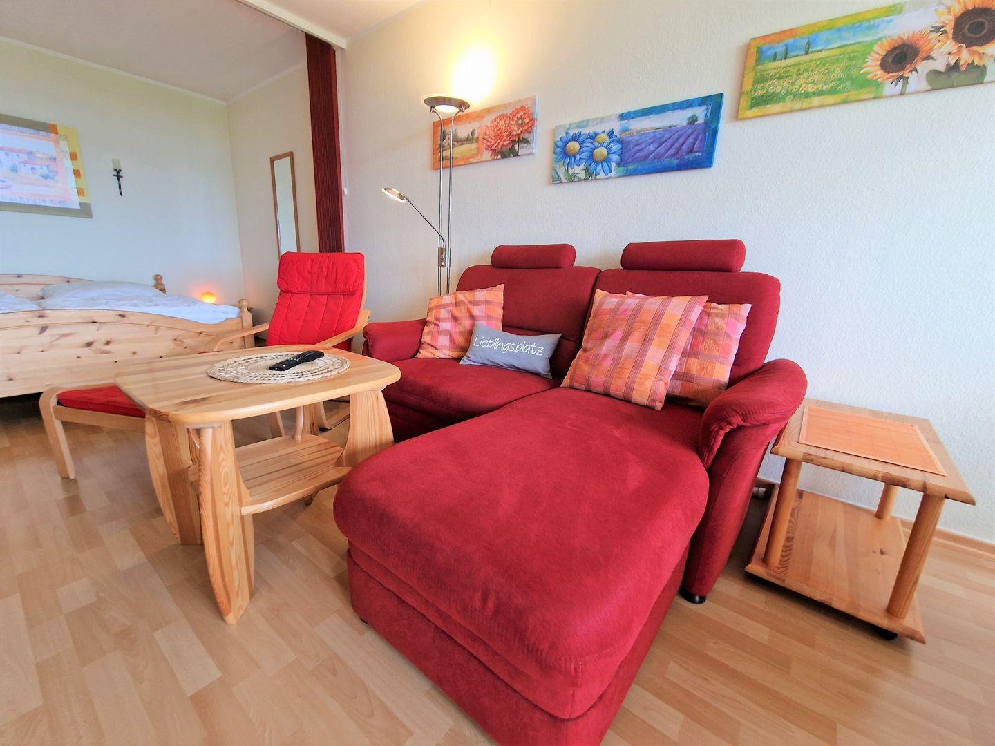 Im Wohnraum befinden sich eine gemütliche Couch (2-Sitzer) und zwei Sessel.