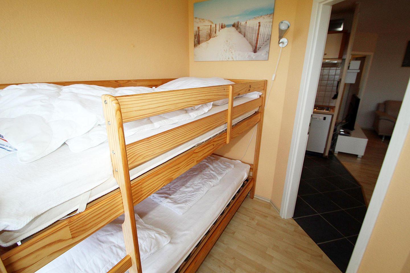 Ein abgetrenntes Schlafzimmer mit Boxspringbett (180/200cm) und ein Kinderzimmer m. Etagenbett bieten für 2 od. 3 Erwachsene und bis 2 Kinder genug Platz für einen schönen Urlaub.