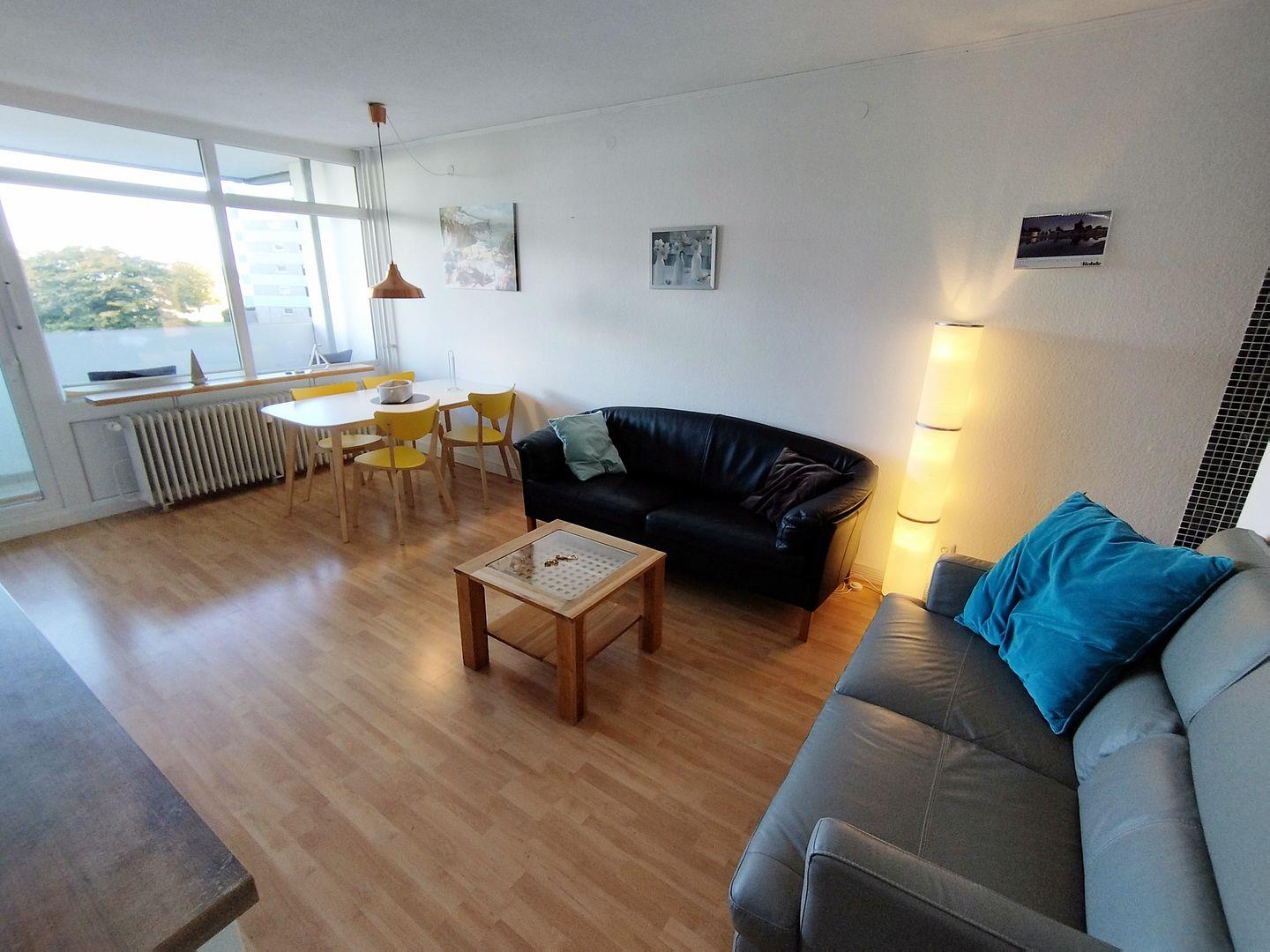 Wohnraum mit Couch, Smart-TV und integrierter Essecke am Fenster mit Ausblick.