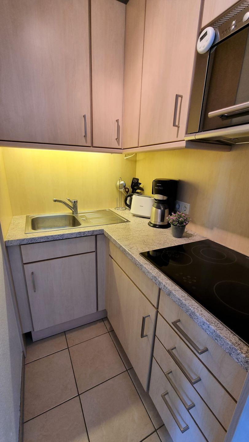 Im offenen Essbereich steht eine gut ausgestattete Kochnische zur Verfügung, die mit Ceranherd, Kühlschrank, Gefrierfach, Mikrowelle, Toaster, Kaffeemaschine, Wasserkocher sowie allen notwendigen Küchenutensilien, Geschirr und Besteck versehen ist. Hier können Sie sich nach Ihren Wünschen selbst versorgen und alle Mahlzeiten in gemütlicher Runde genießen.