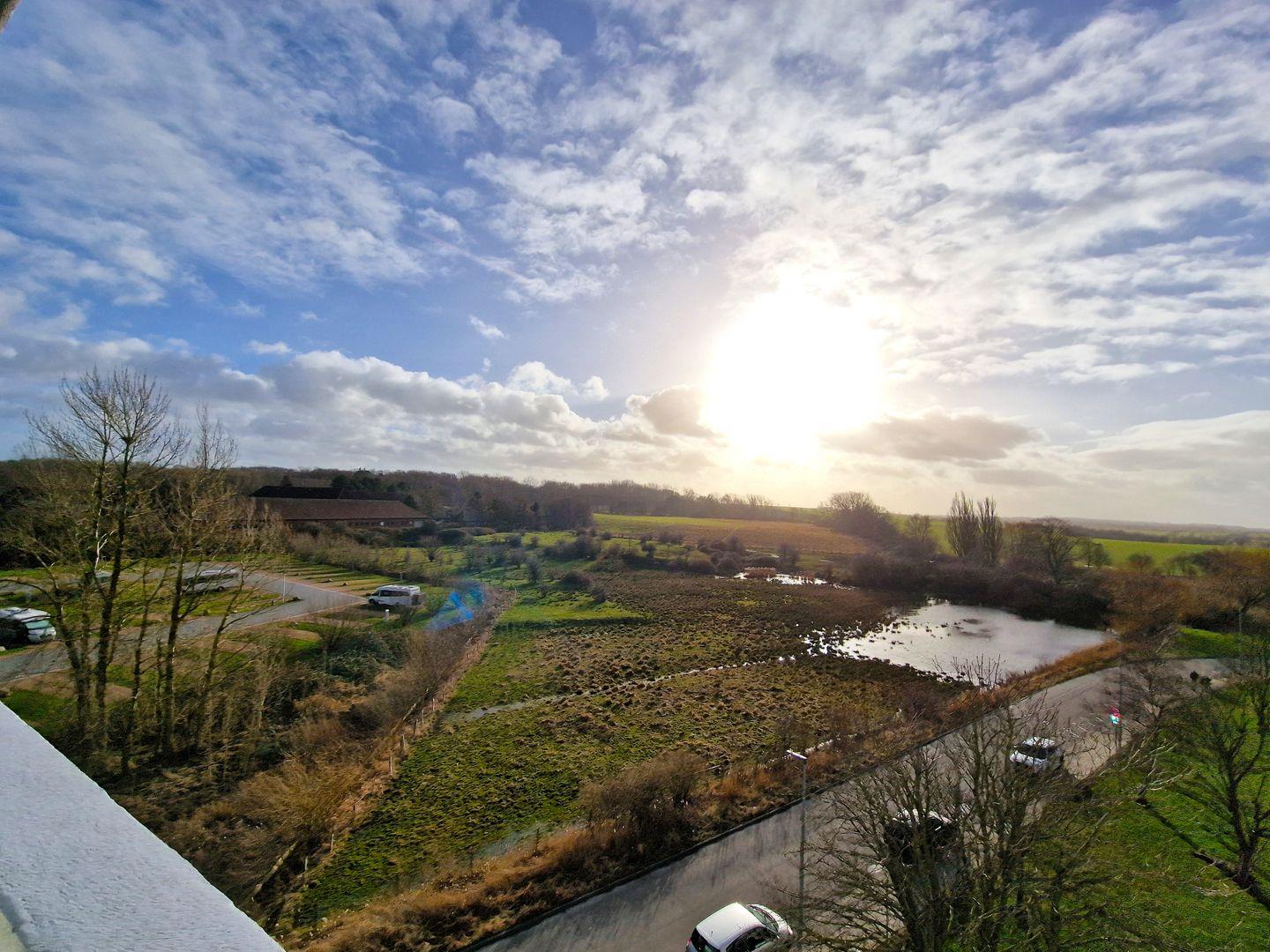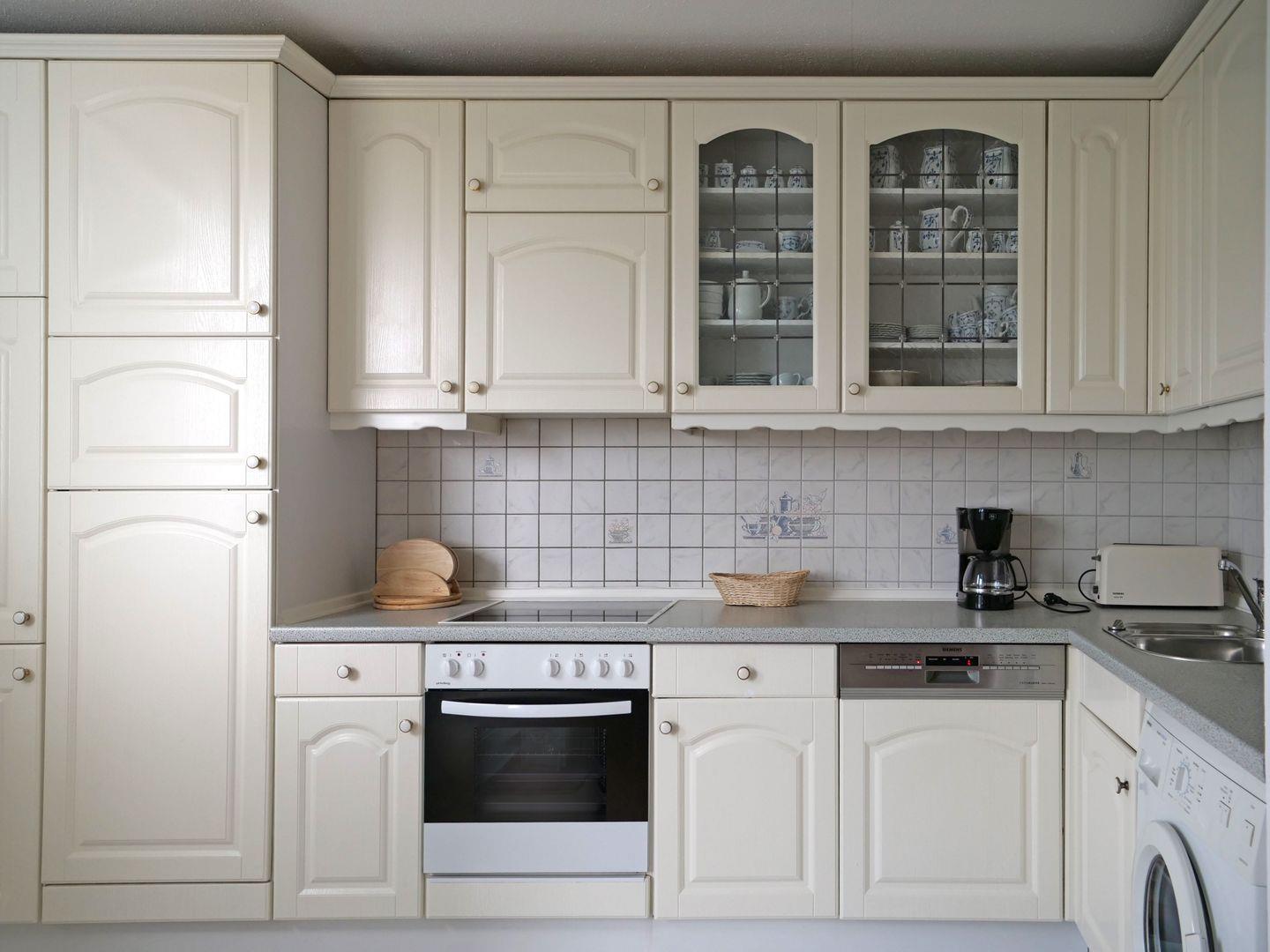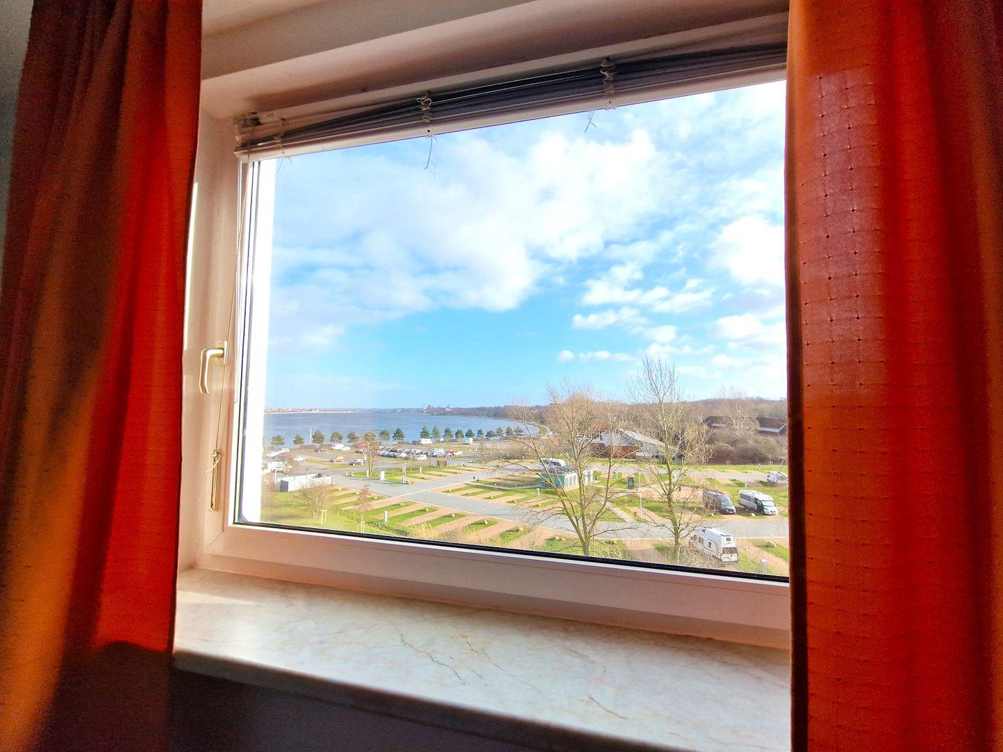 Die offene Landhaus-Kochnische grenzt an den Wohnbereich und ist so gestaltet, dass Kochen Spaß macht: Ceranfeld, Mikrowelle, Spülmaschine, Kühlschrank, Kaffeemaschine, Wasserkocher und Toaster stehen bereit, damit Sie alle Mahlzeiten ganz nach Ihrem Geschmack zubereiten können. Im separaten Schlafzimmer erwartet Sie ein komfortables Doppelbett, von dem aus Sie den Blick über den Binnensee zum Jachthafen genießen können – ein kleiner visueller Höhepunkt, der den Raum besonders macht.
