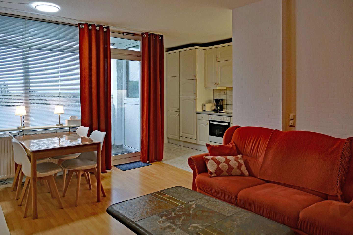 Betreten Sie diese freundliche Ferienwohnung mit ca. 45?m² Wohnfläche für bis zu 2 Personen und lassen Sie den Alltag sofort hinter sich. Gleich im Wohnbereich fällt der Blick auf das bequeme Sofa und den Fernsehsessel aus Microfaser – perfekt zum Entspannen nach einem aktiven Tag. Ein Flachbild-TV, eine Musikanlage und ein DVD-Player sorgen für Unterhaltung, während der Essplatz direkt am Fenster zum gemütlichen Frühstück oder Abendessen einlädt.