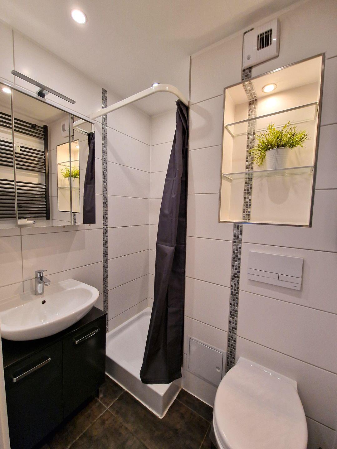 Vom Flurbereich aus gelangen Sie in das Badezimmer mit WC und und Dusche (Duschvorhang, mittelhoher Einstieg).