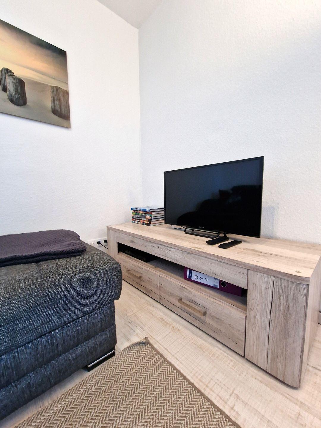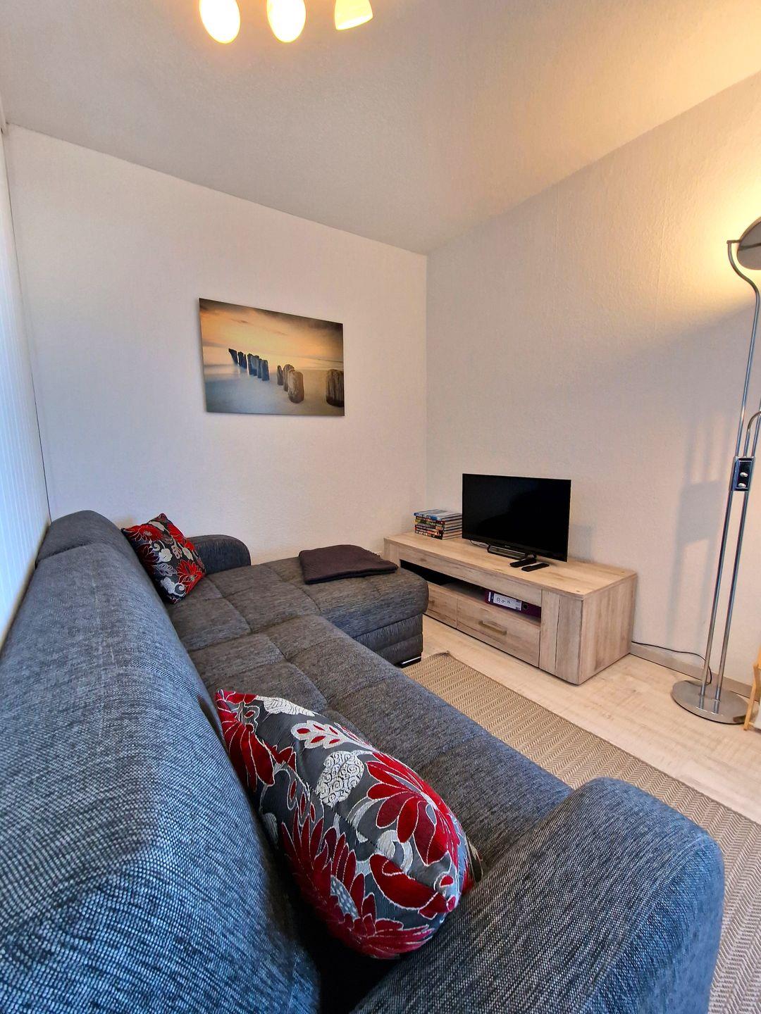 Der Wohnbereich ist ausgestattet mit einer grau/schwarz melierten Couch-Garnitur in L-Form inkl. Schlaffunktion, einem kleinen ausziehbaren (drei runde Elemente) Couchtisch sowie einem Sideboard auf dem sich ein 80cm Flachbild-TV befindet. Eine Musikanlage sowie ein DVD-BlueRay Player sorgen weiterhin für Unterhaltung.