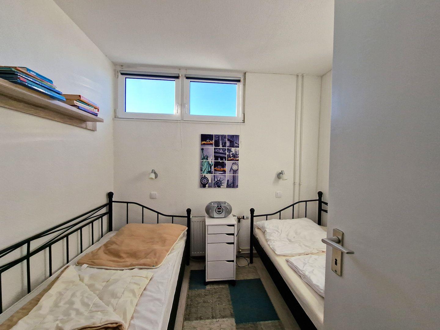 Im separaten Kinderzimmer (mit einer Tür versehen) stehen zwei Einzelbetten (je 90*200). Das Kinderzimmer verfügt ober ein Oberfenster, welches zu öffnet geht (Verdunklungsrollos sind vorhanden).