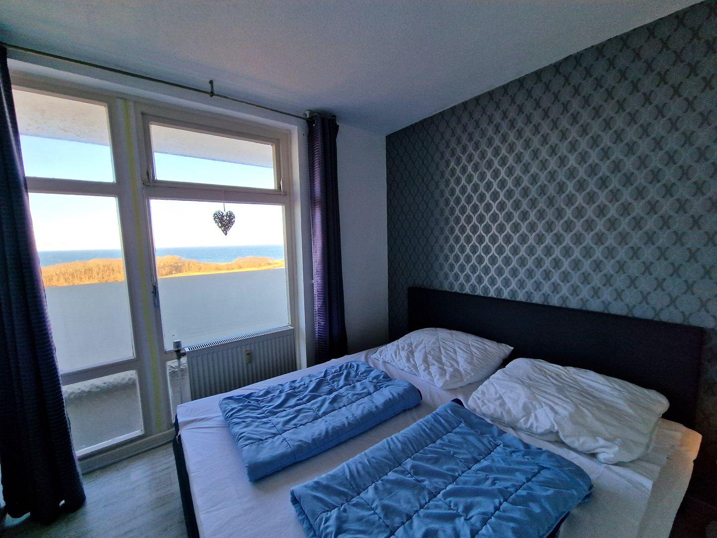 Gleich rechts davon gelegen, befindet sich das separate Schlafzimmer mit großem Boxspringbett (durchgängige Matratze 180*200) und tollem Panoramafenster (zu öffnen).