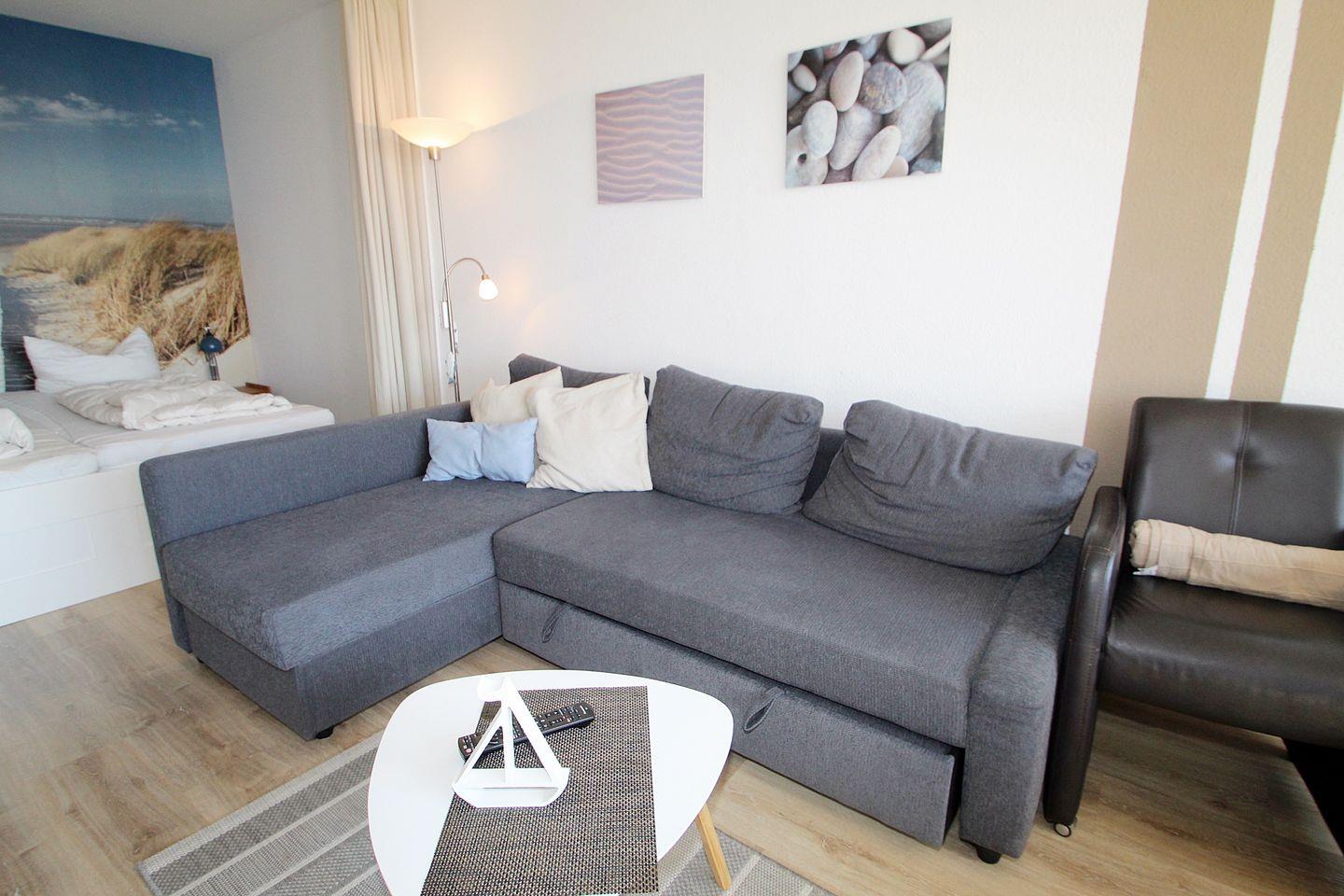 Den Schlafbereich mit der wunderschönen Ostseetapete können Sie mit einem Vorhang vom Wohnbereich trennen.