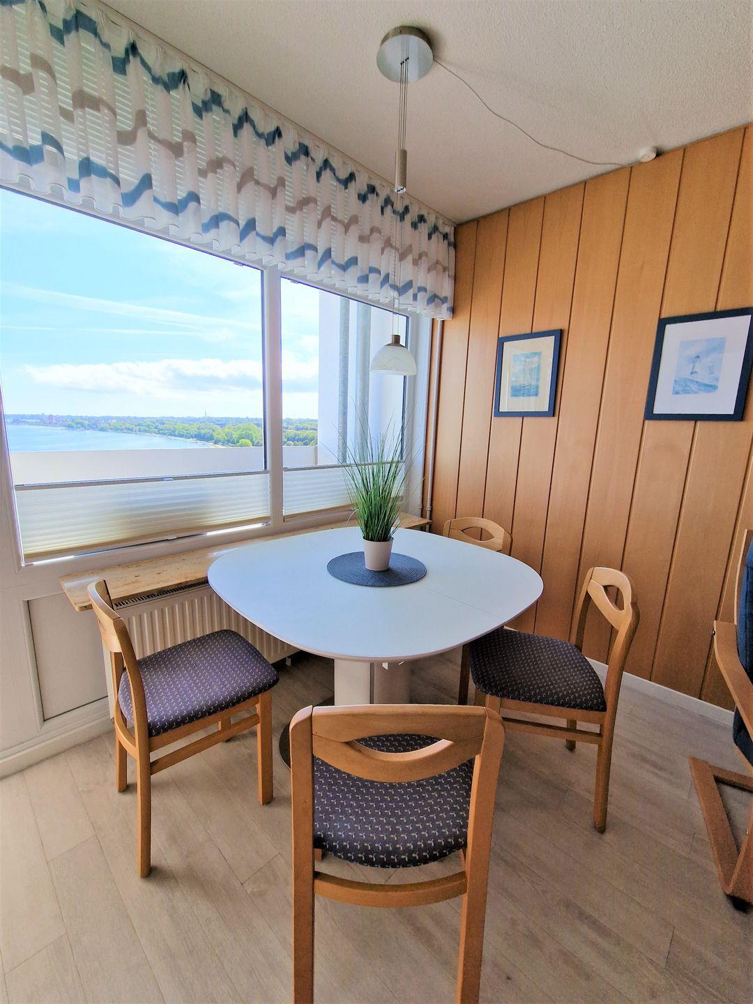 Helle Ferienwohnung in der 13. Etage mit Balkon und traumhaftem Blick auf Binnensee, Ostsee und Fehmarnsundbrücke.