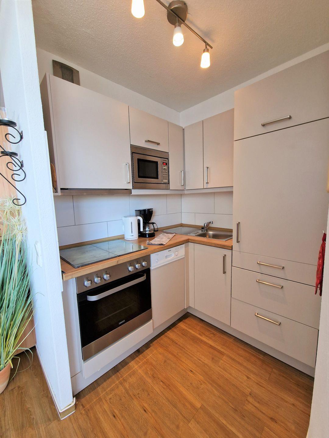 Die neue offene Einbauküche ist mit einem Backofen ,Ceranfeld (4 Platten) , Mikrowelle und Spülmaschine ausgestattet.