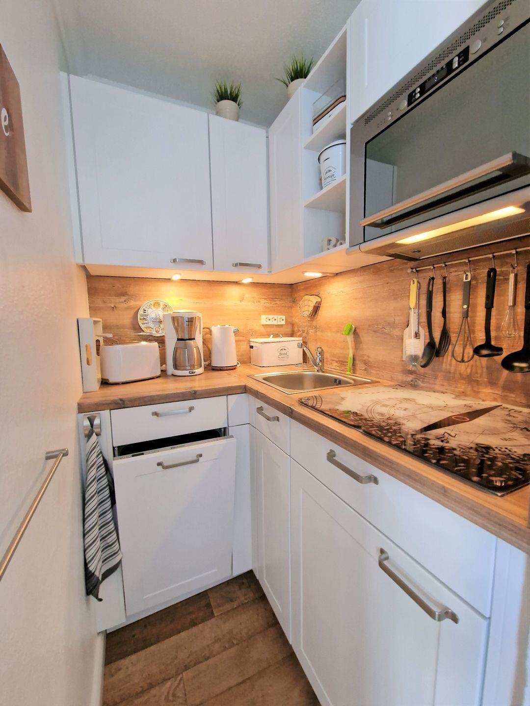 Küche mit 4er-Ceranfeld , Geschirrspülmaschine und Kombi-Mikrowelle.