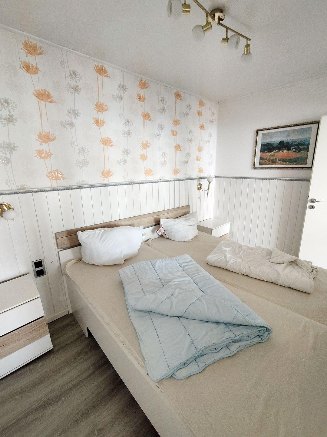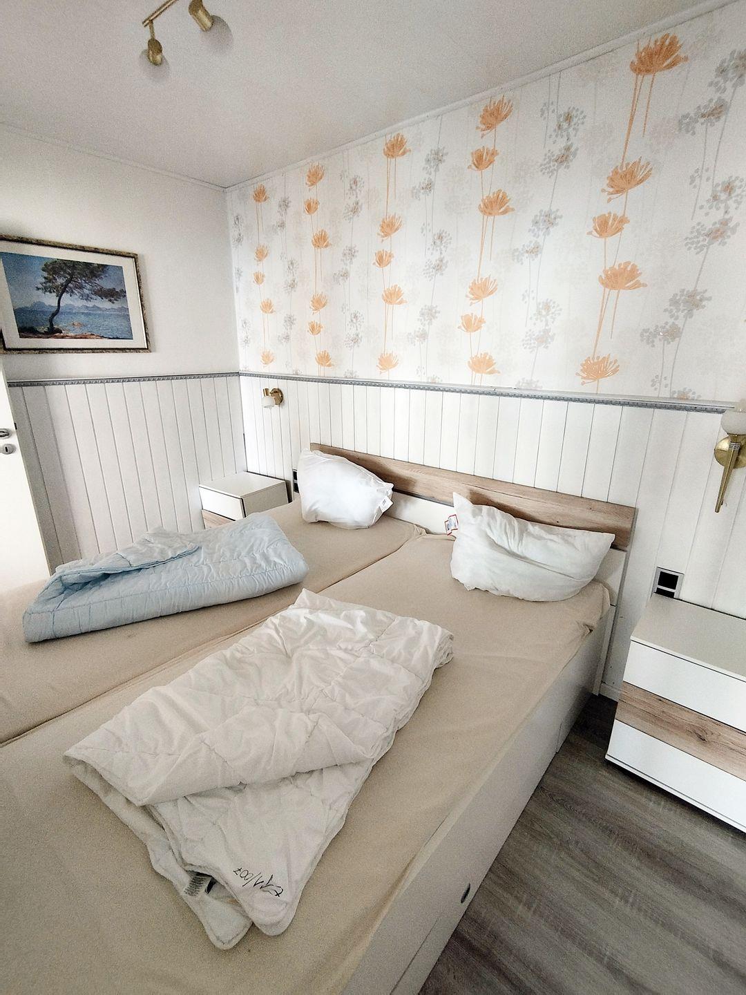 Im Schlafbereich stehen zwei Einzelbetten (90*200cm) die zusammen gestellt sind und 2 kleine Nachttische.