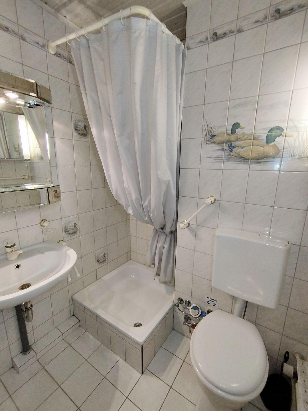Das helle Bad hat 2 große Spiegelschränke, und eine Dusche mit Vorhang.