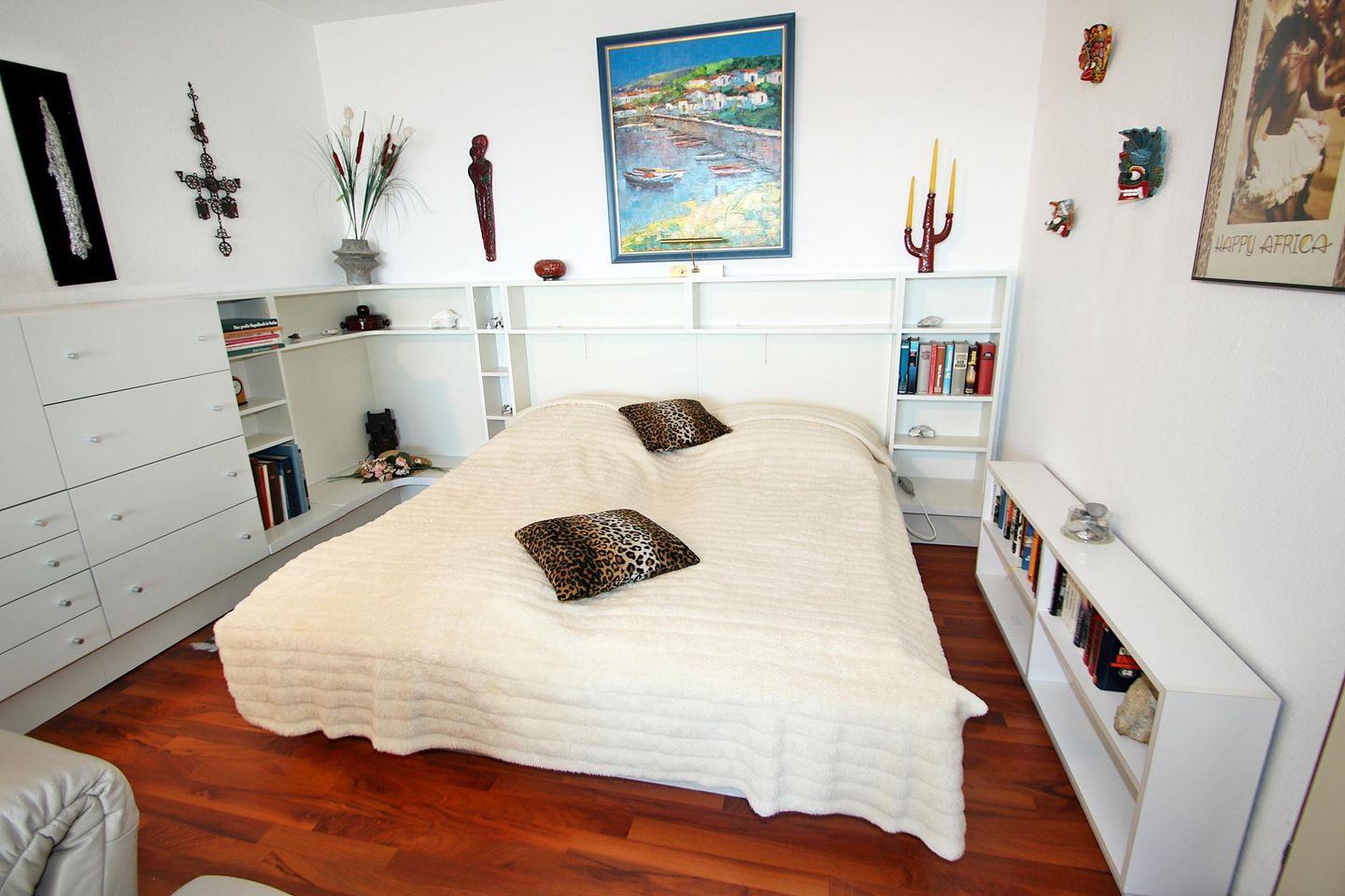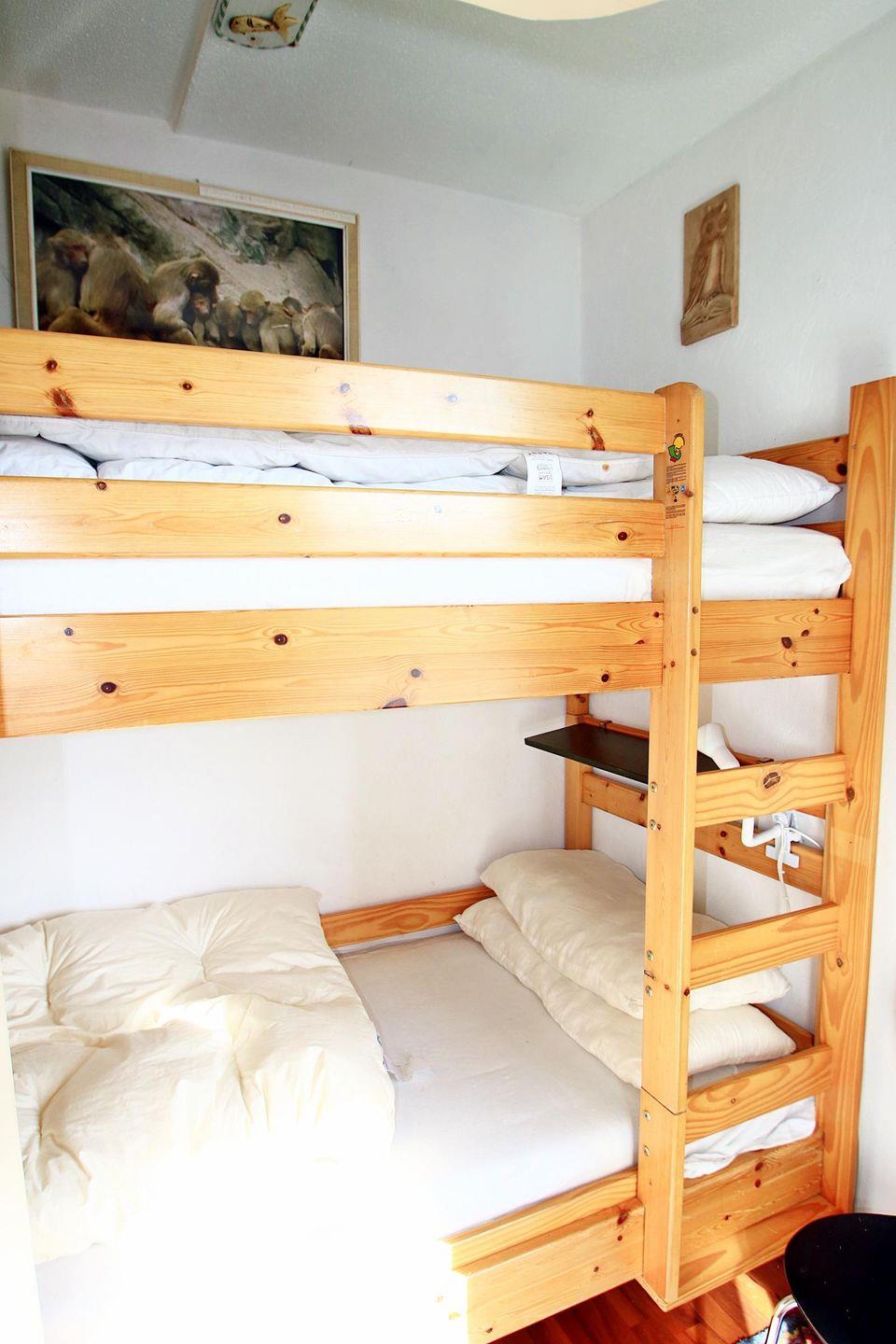 Der Schlafbereich ist offen zum Wohnraum gestaltet und verfügt über ein Doppelbett (180/200cm) mit verstellbaren Lattenrosten.