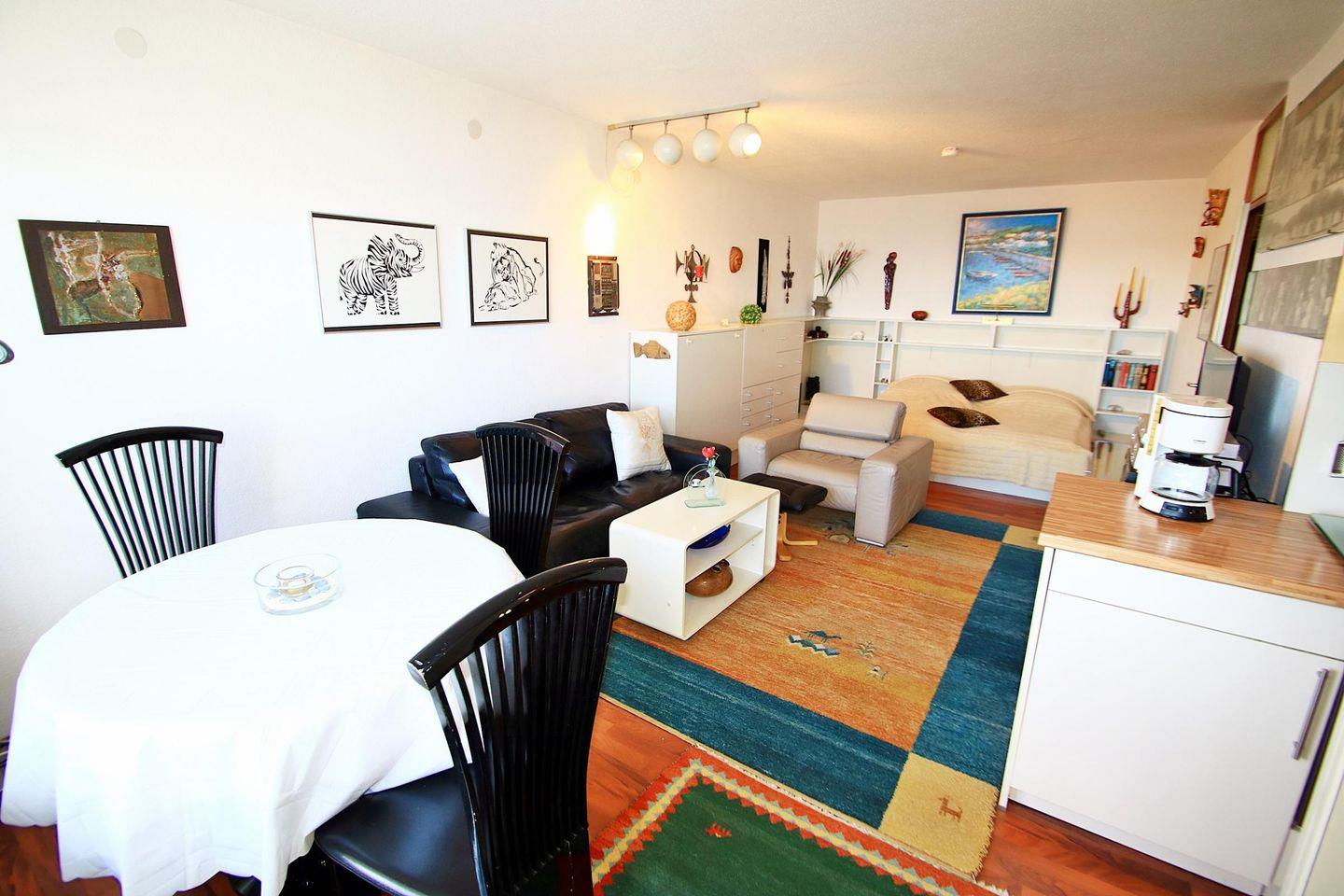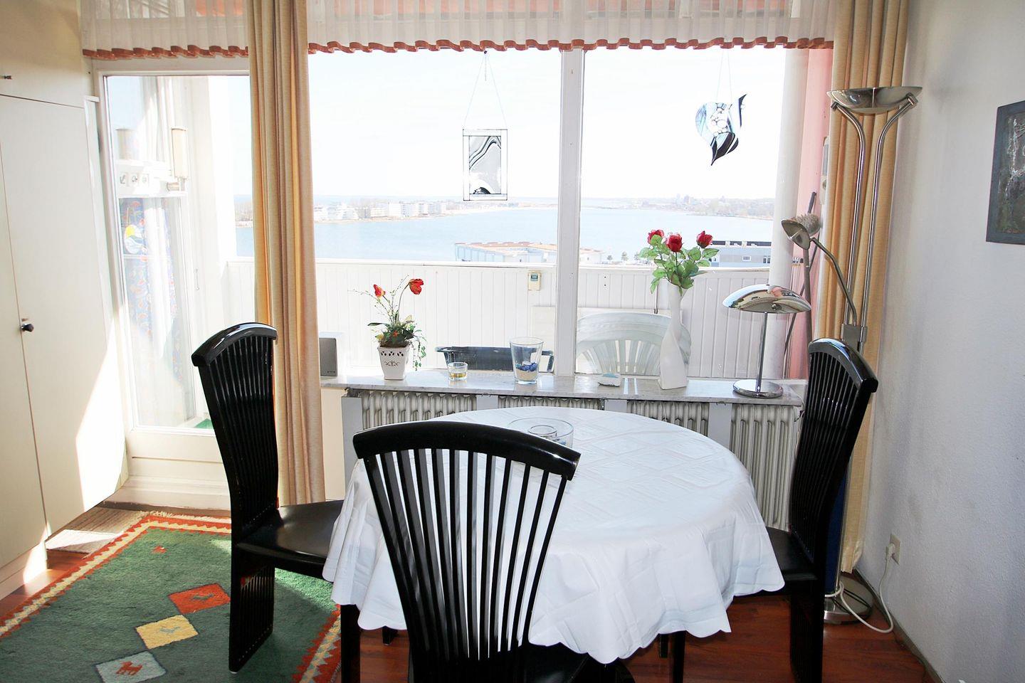 Schöne, helle Ferienwohnung für bis zu 4 Personen mit Laminatboden und Balkon in der 10. Etage mit tollem Blick auf die Ostsee und über den Binnensee Richtung Jachthafen.