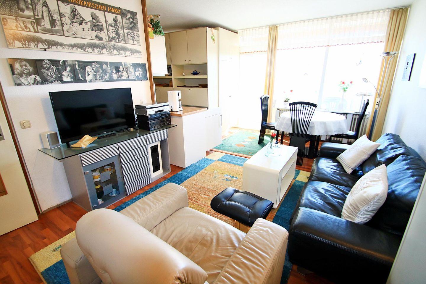 Wohnraum mit einer Ledergarnitur, neuem Flachbild-TV (40Zoll) und Musikanlage.