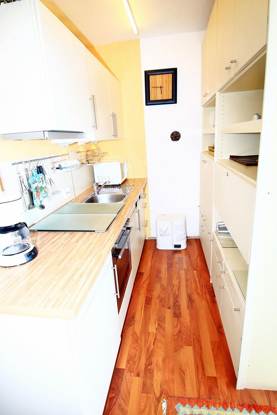 Auch sind vorhanden: Kühlschrank mit Gefrierfach, Kaffeemaschine, Toaster, Wasserkocher, Eierkocher, Mixer, Brotschneidemaschine, Küchenwaage und ein Bügeleisen.