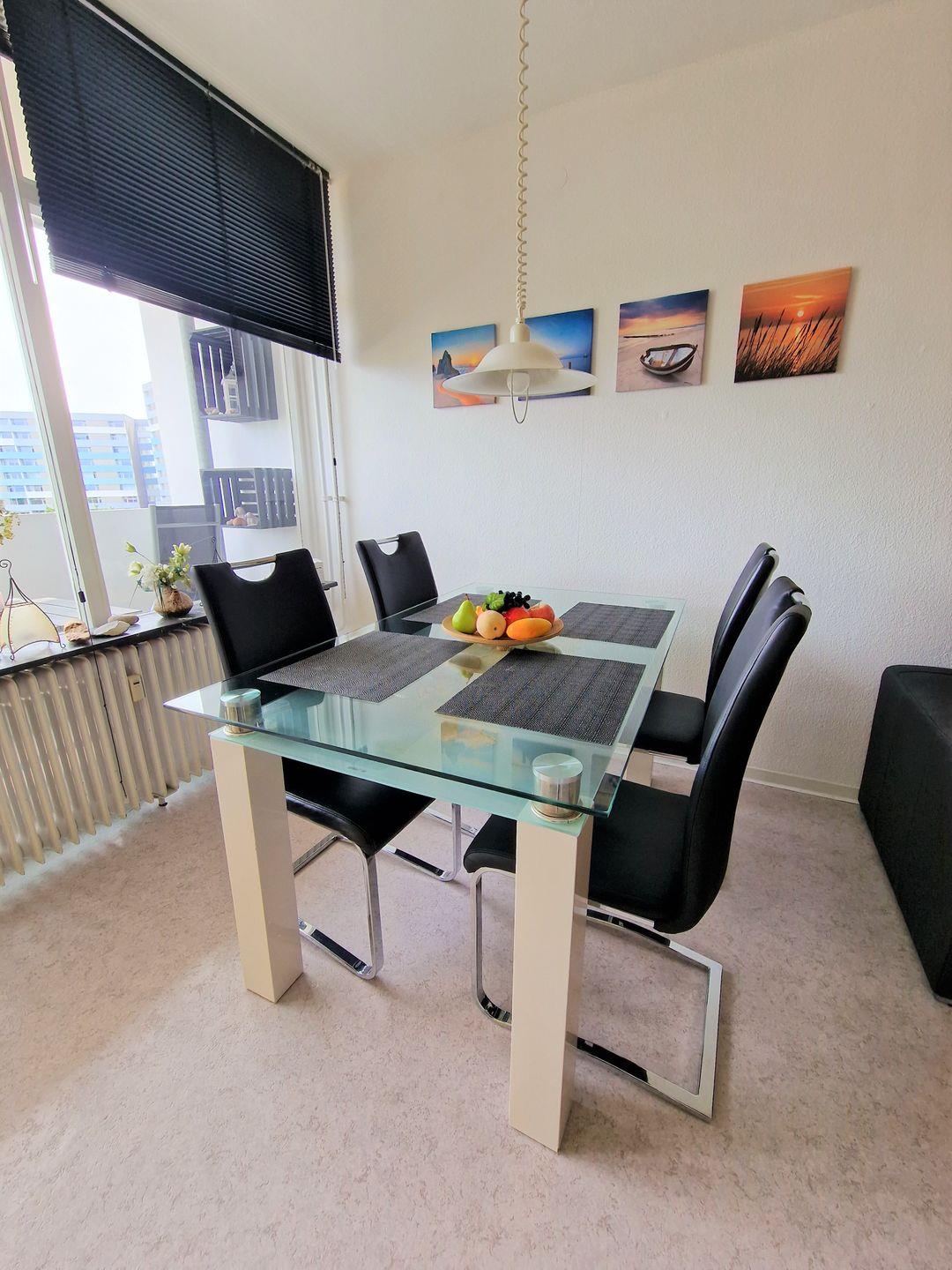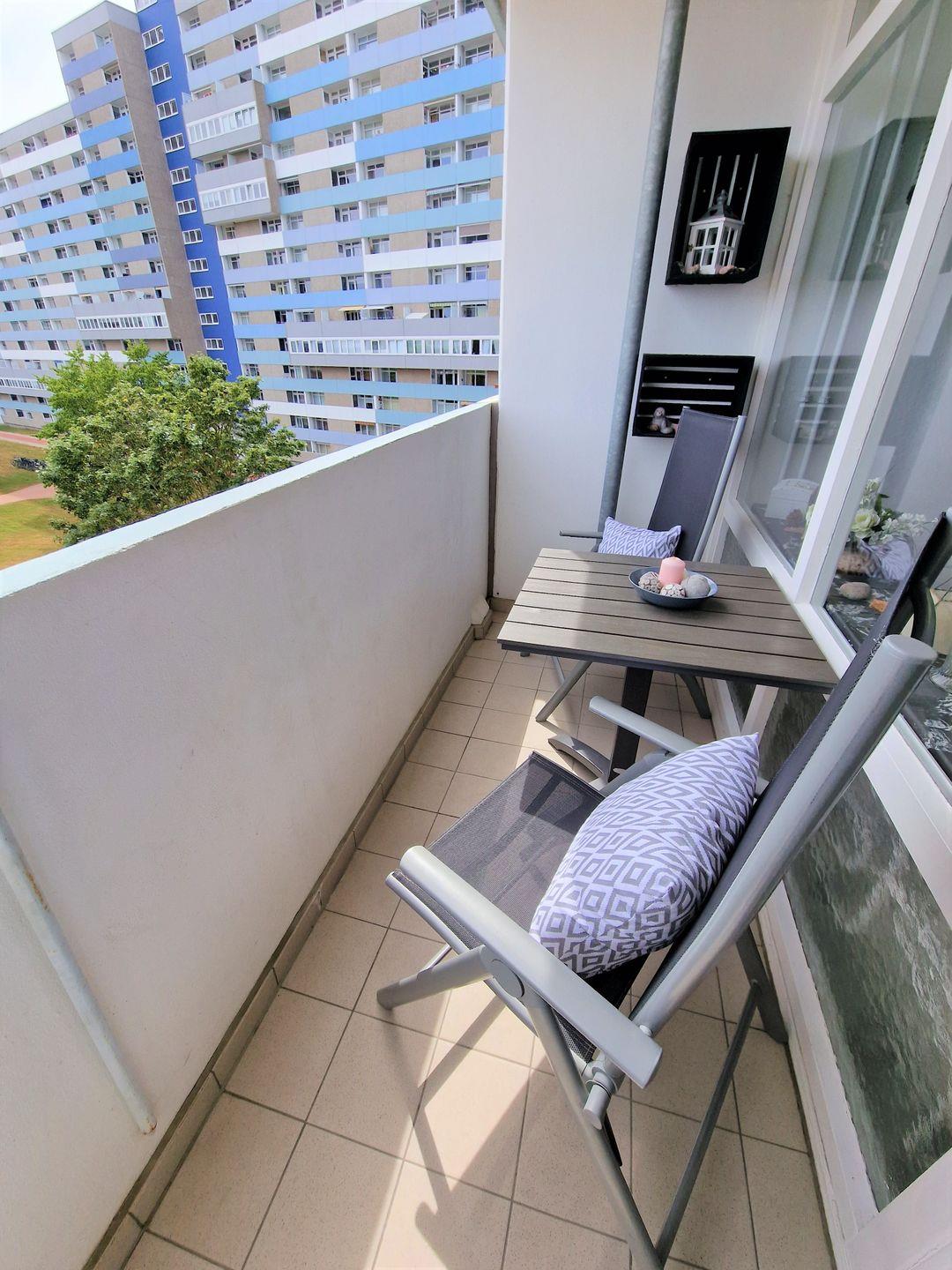 Gemütliche Ferienwohnung mit Balkon und Binnenseeblick in Heiligenhafen, ideal für einen entspannten Ostseeurlaub.