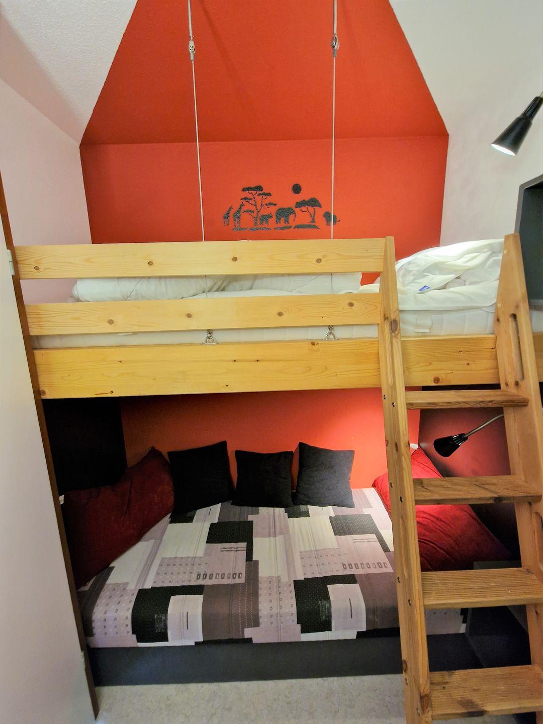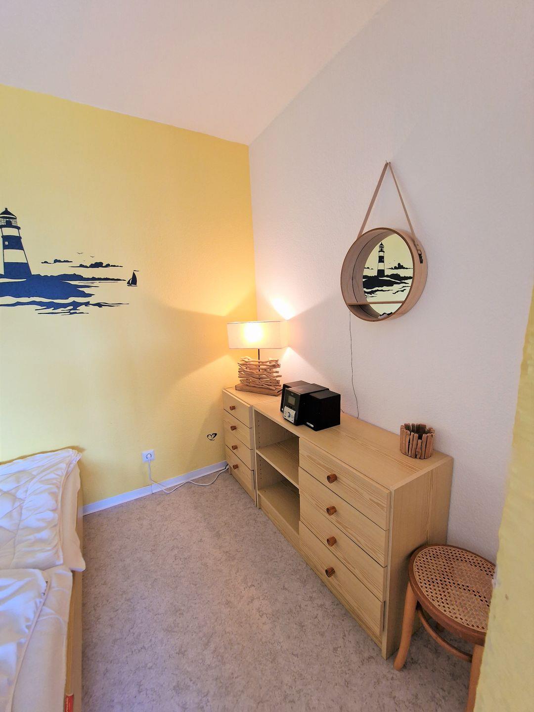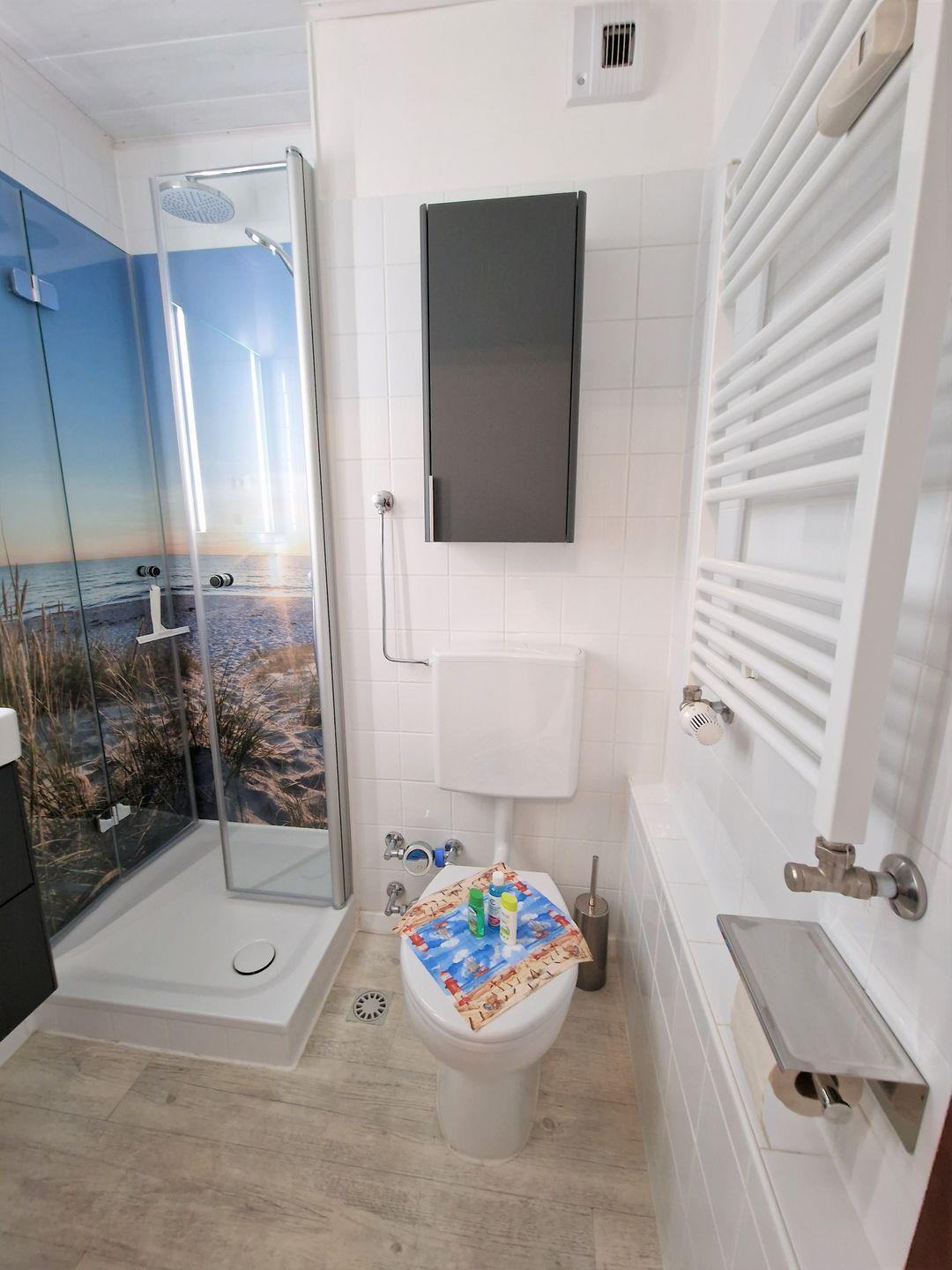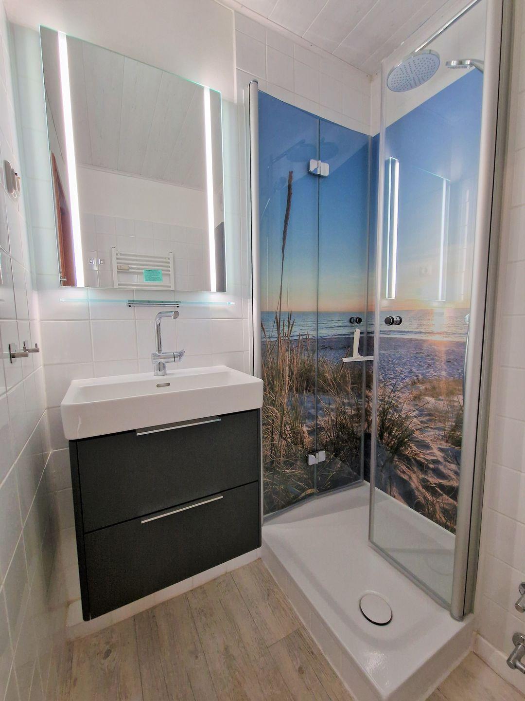 Der Elternschlafbereich ist durch einen Vorhang vom Wohnbereich abgetrennt und verfügt über ein Doppelbett mit zwei einzelnen Matratzen (90 x 200 cm). Das separate Kinderzimmer bietet ein Hochbett und eine Schlafcouch (80 x 190 cm). Das Badezimmer ist hell und modern, mit Dusche und WC. Ein besonderes Highlight: In der Dusche ist ein großes, stimmungsvolles Strandbild angebracht, das beim Duschen ein bisschen Urlaubsgefühl direkt ans Meer zaubert.