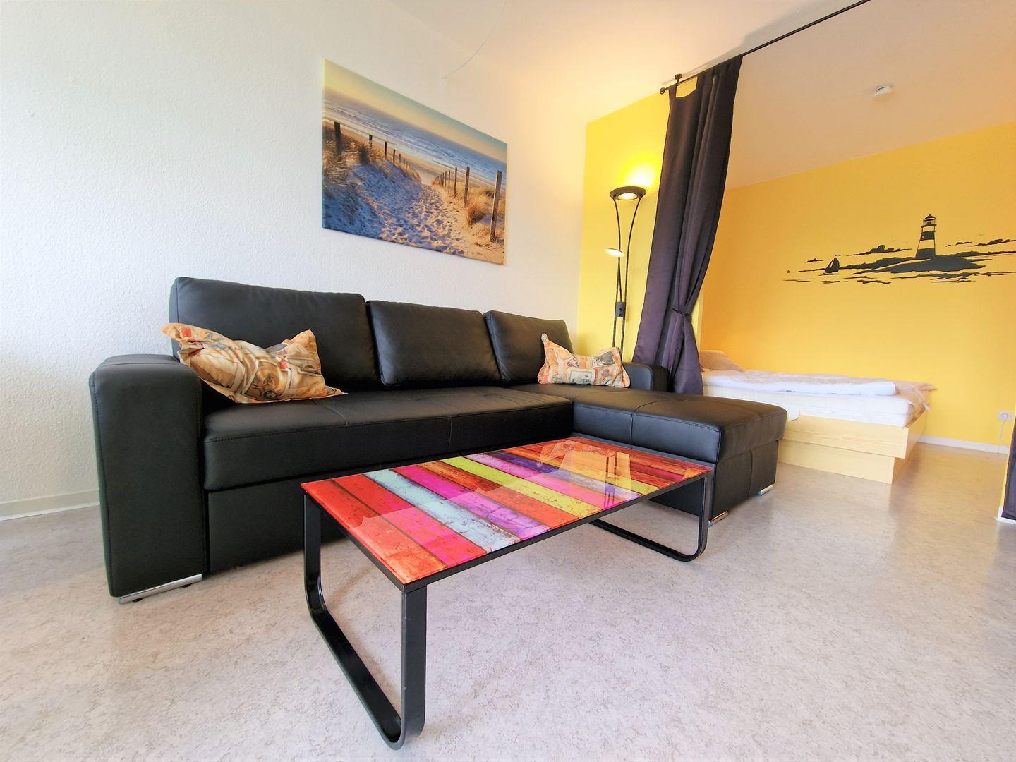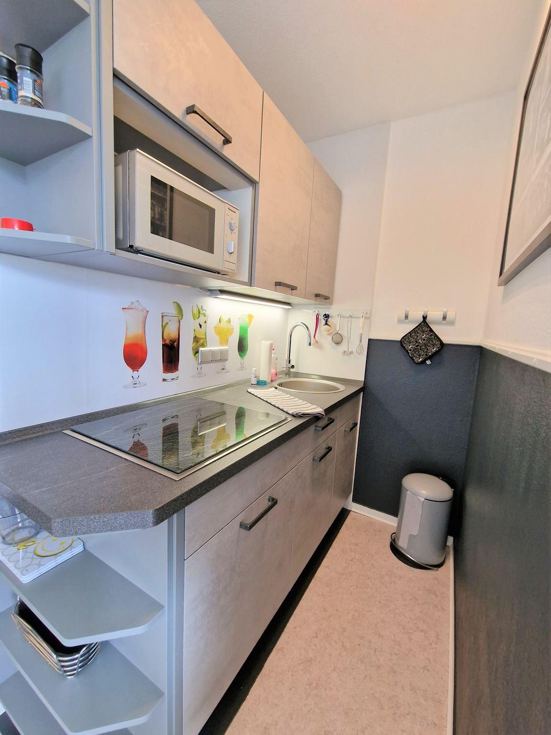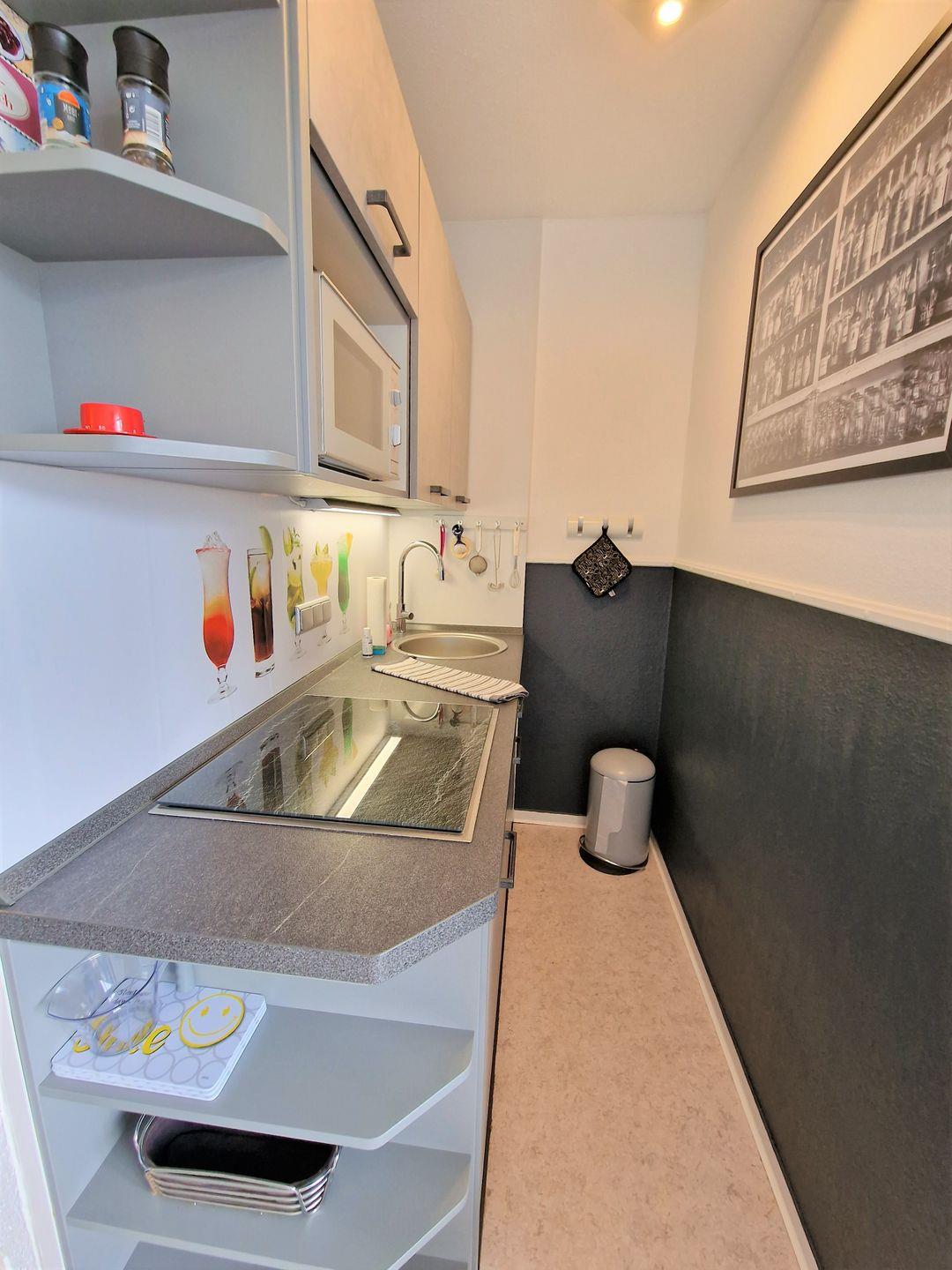 Der Wohnbereich verfügt über eine bequeme Sitzecke und einen Flachbild-TV. Am Essbereich am Fenster können Sie gemeinsam Mahlzeiten genießen und den Blick nach draußen schweifen lassen. Die Küche ist praktisch ausgestattet mit 4-Platten-Ceranfeld, Kühlschrank mit Gefrierfach, Kaffeemaschine, Toaster, Wasserkocher und Mikrowelle.