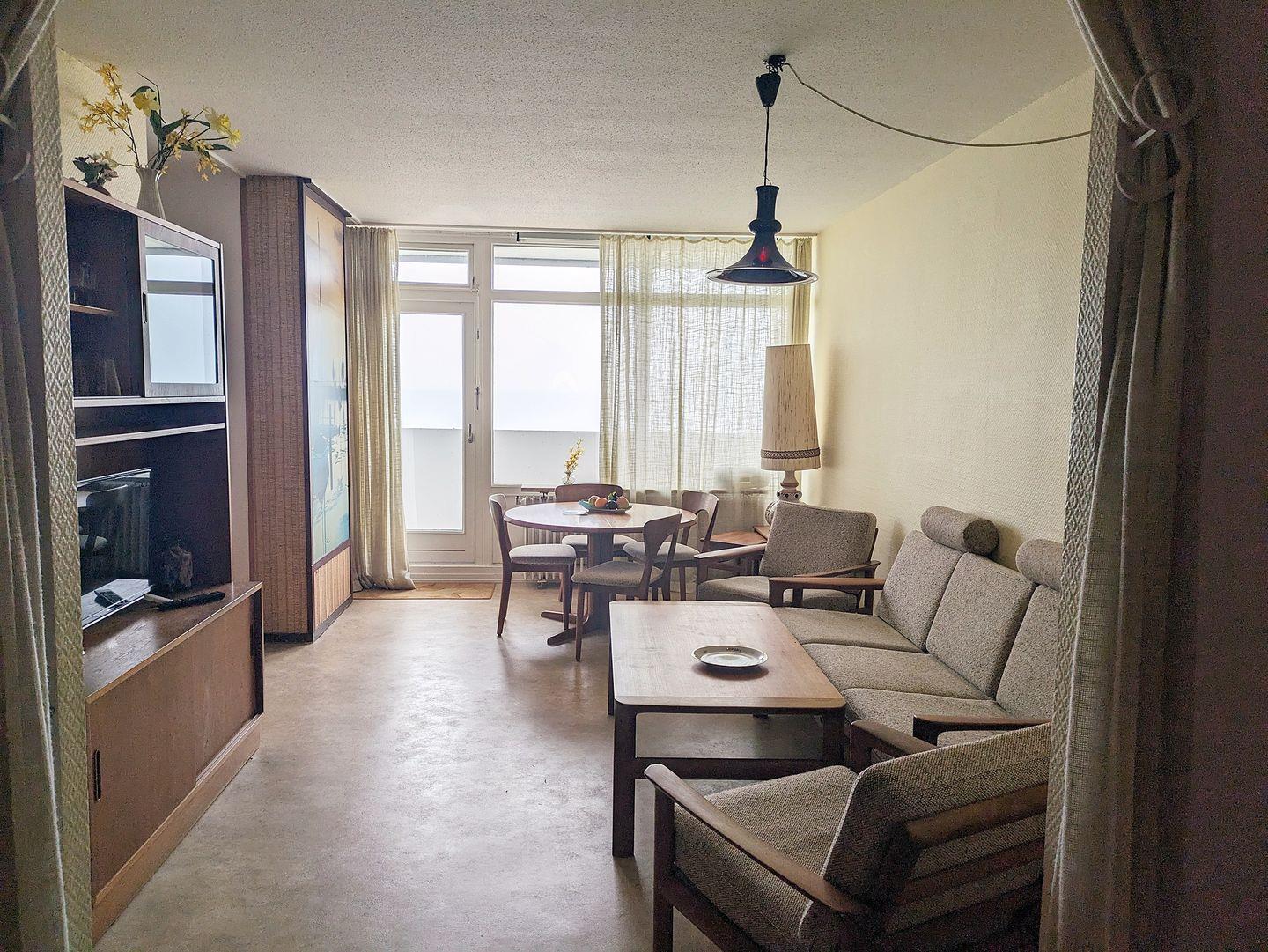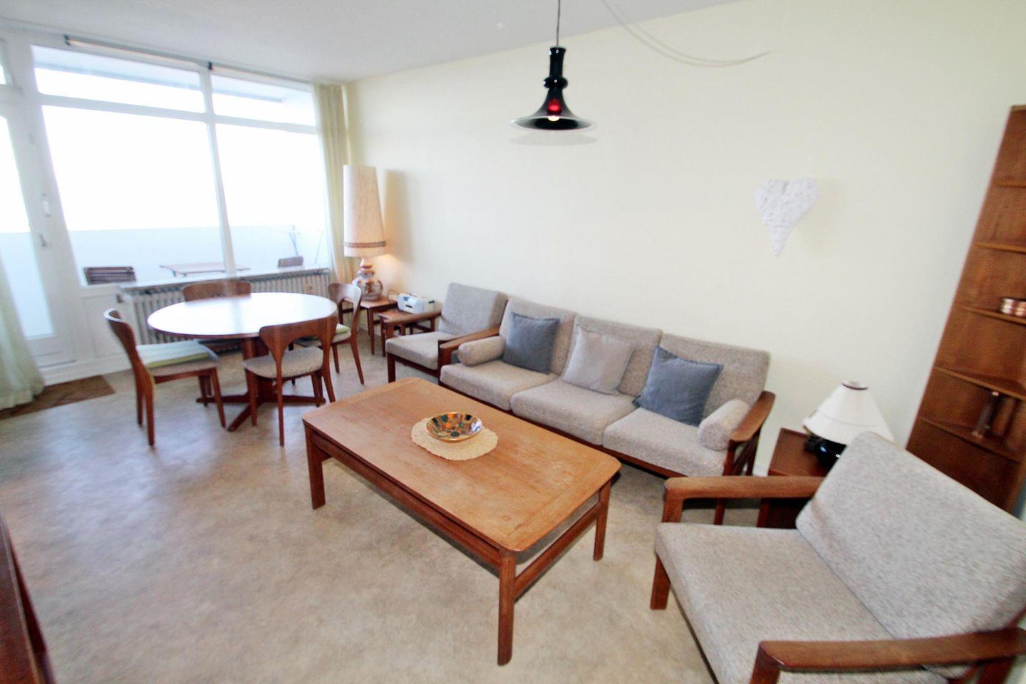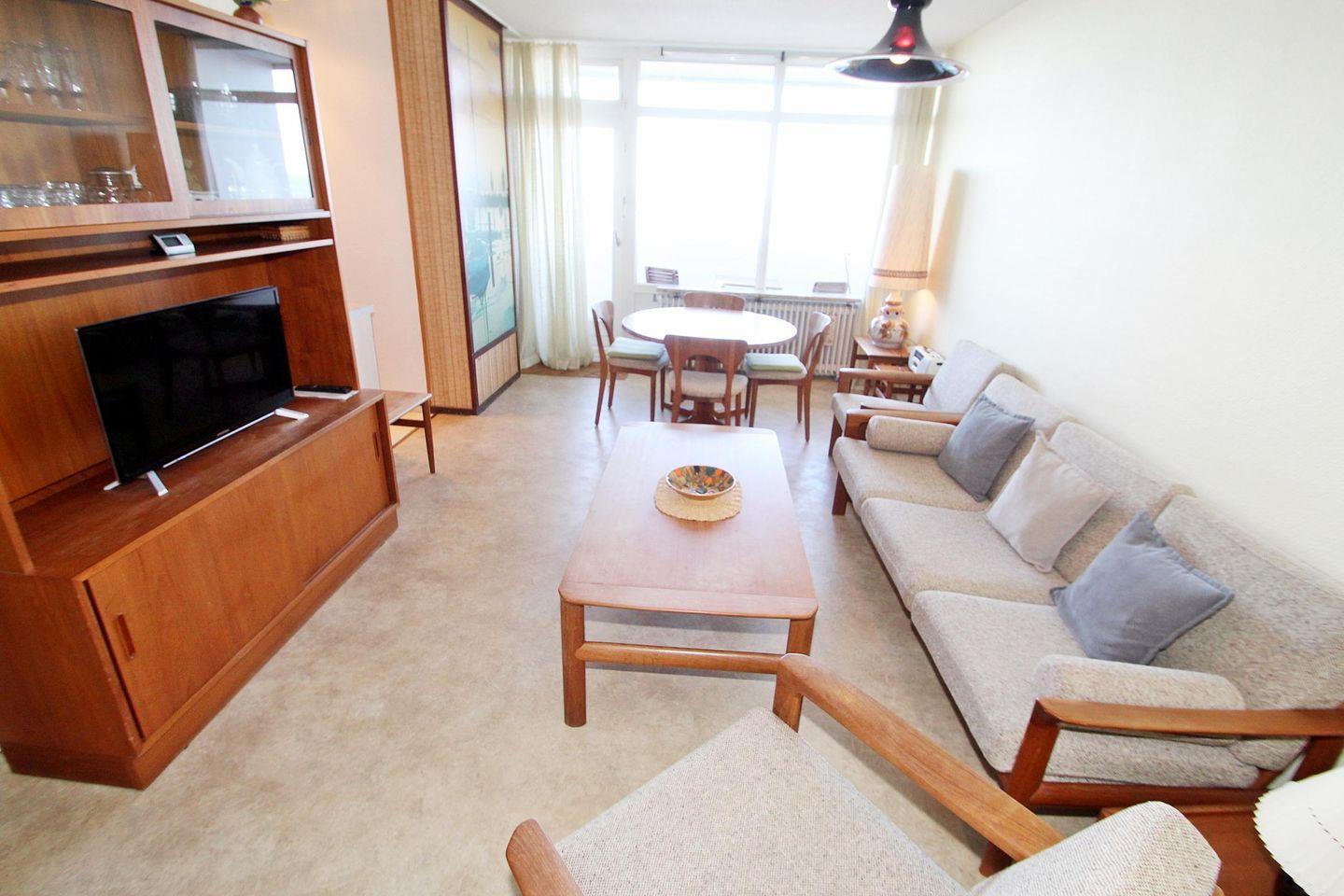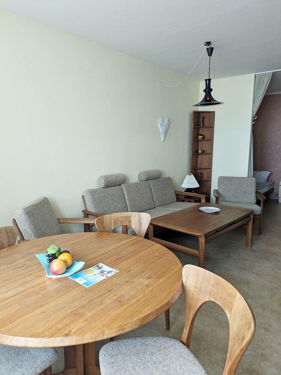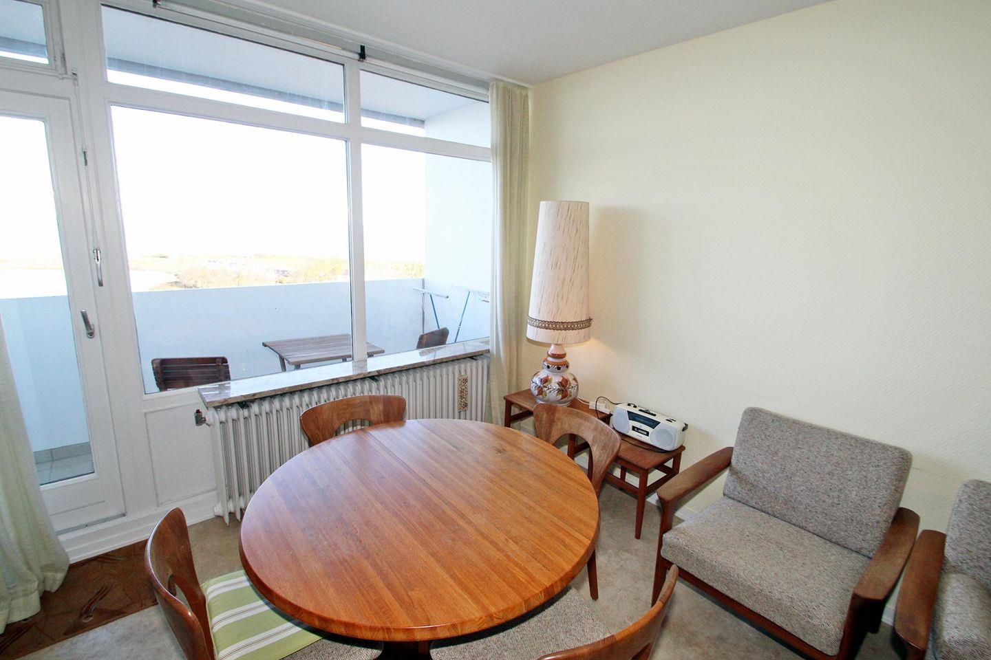 Gepflegte, mit dänischen Design-Möbeln ausgestattete Ferienwohnung in der 12. Etage mit Balkon zur Nordseite und Blick über die Ostsee Richtung Insel Fehmarn.