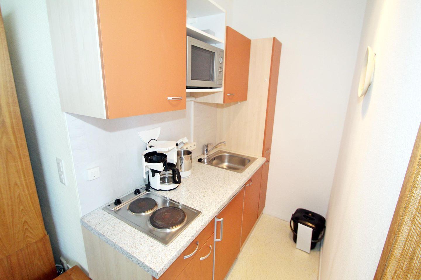 Küche mit 2-Plattenherd und Mikrowelle.