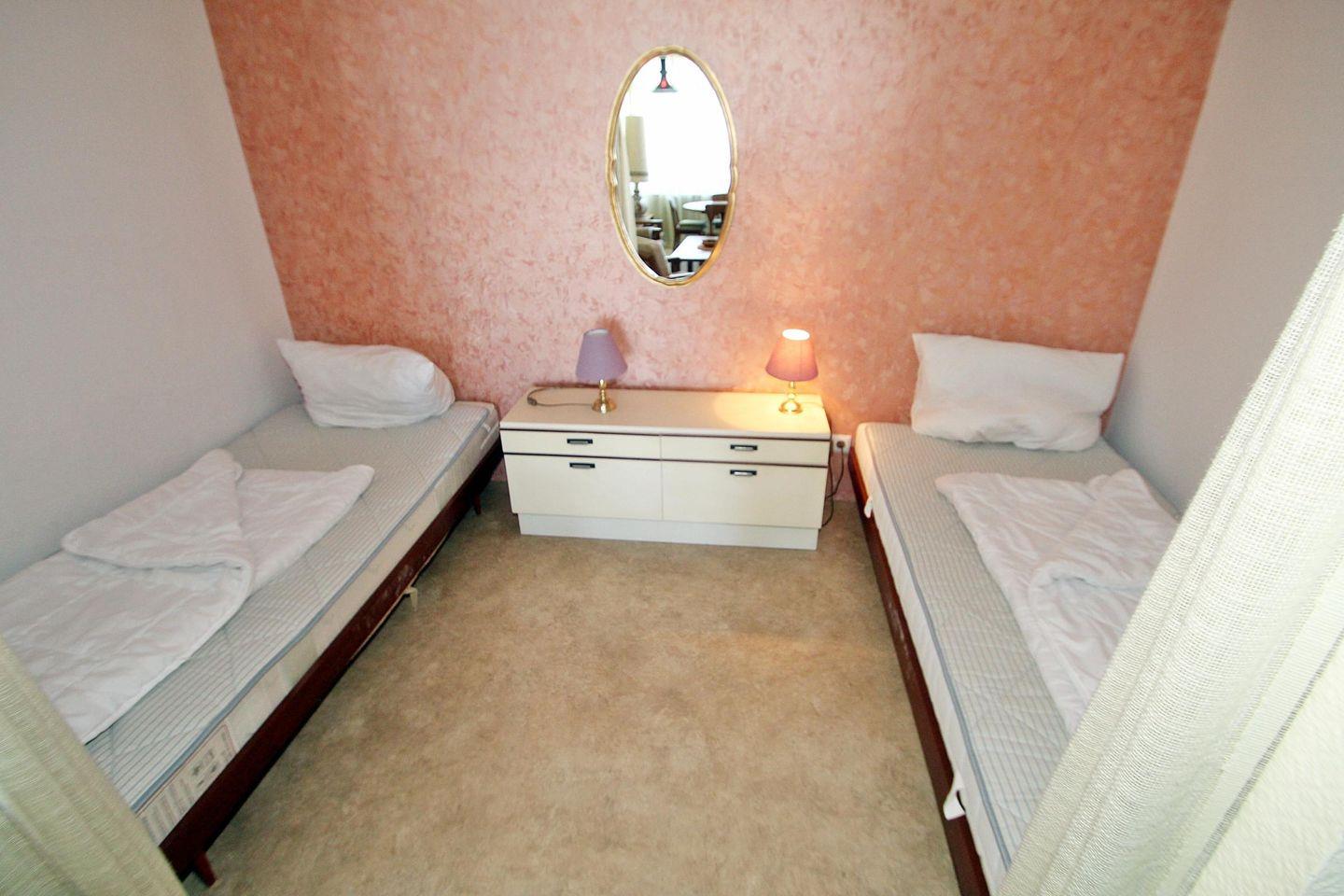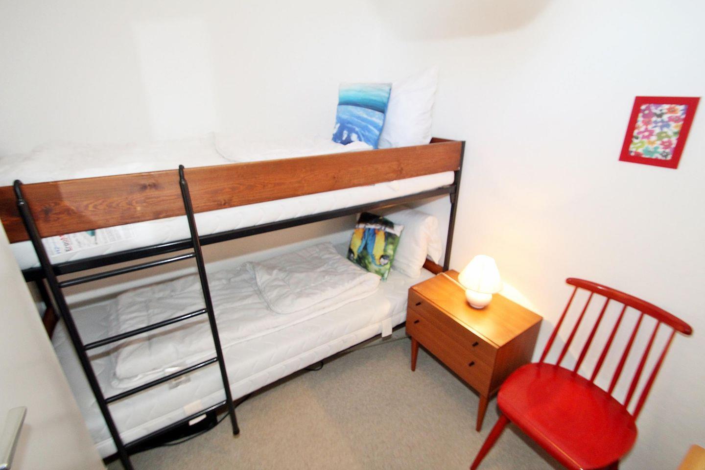 Schlafbereich mit zwei Einzelbetten, Kinderzimmer mit Etagenbett.