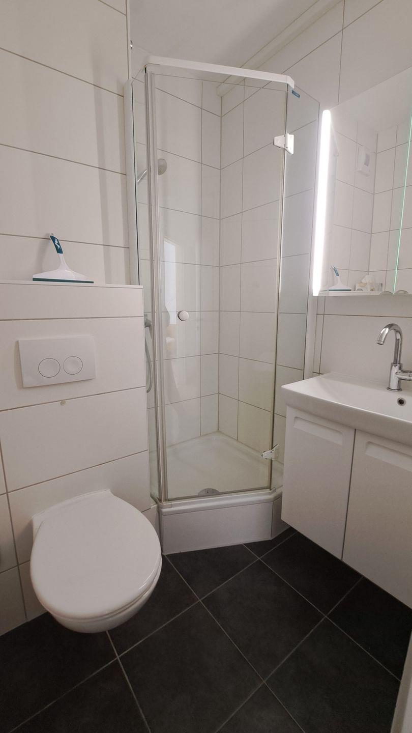 Das helle Bad ist mit einer Duschkabine ausgestattet.