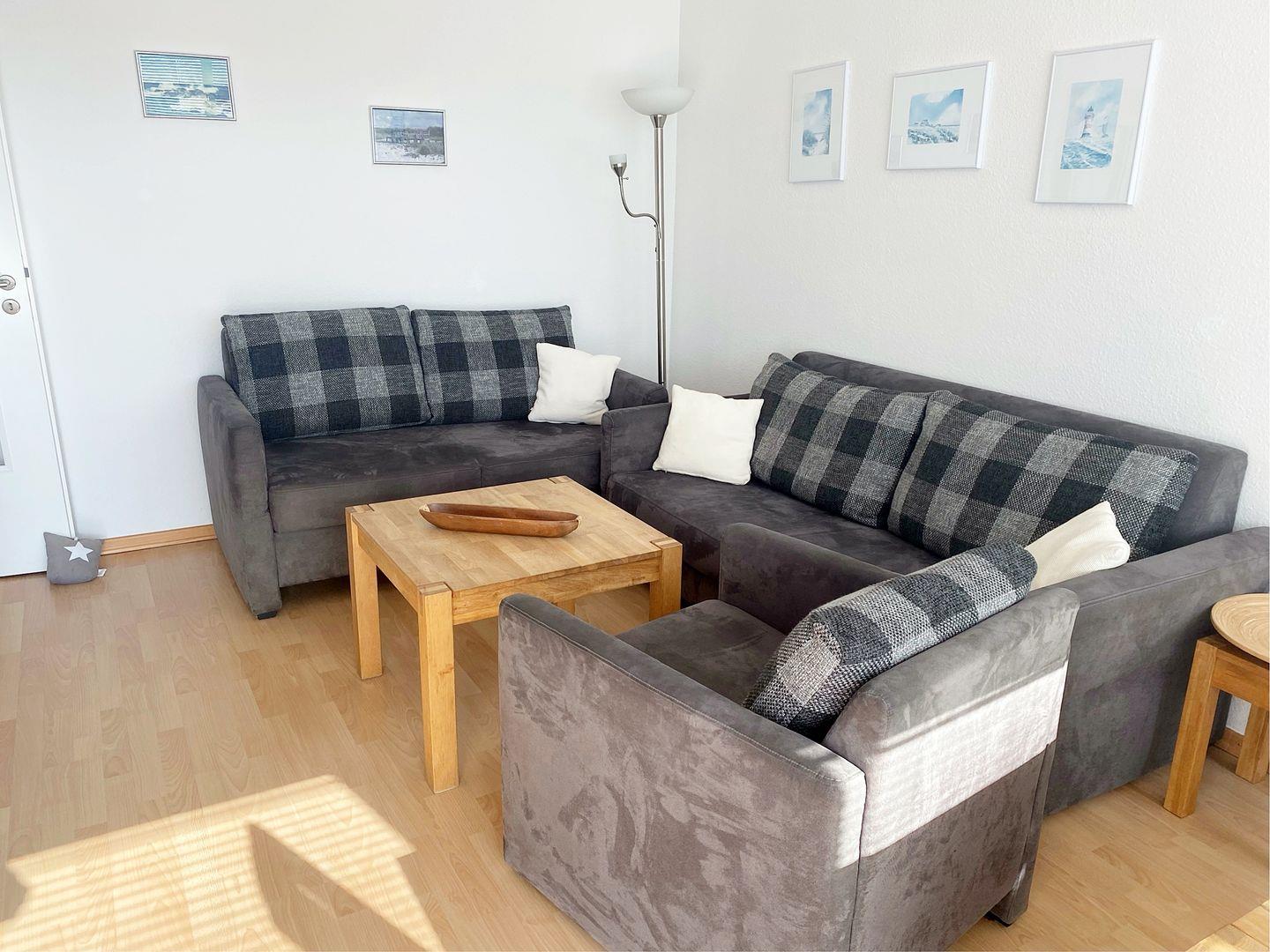 Moderner Wohnraum mit zwei Zweisitzern und einem Sessel, LCD-TV sowie einem Internetradio.