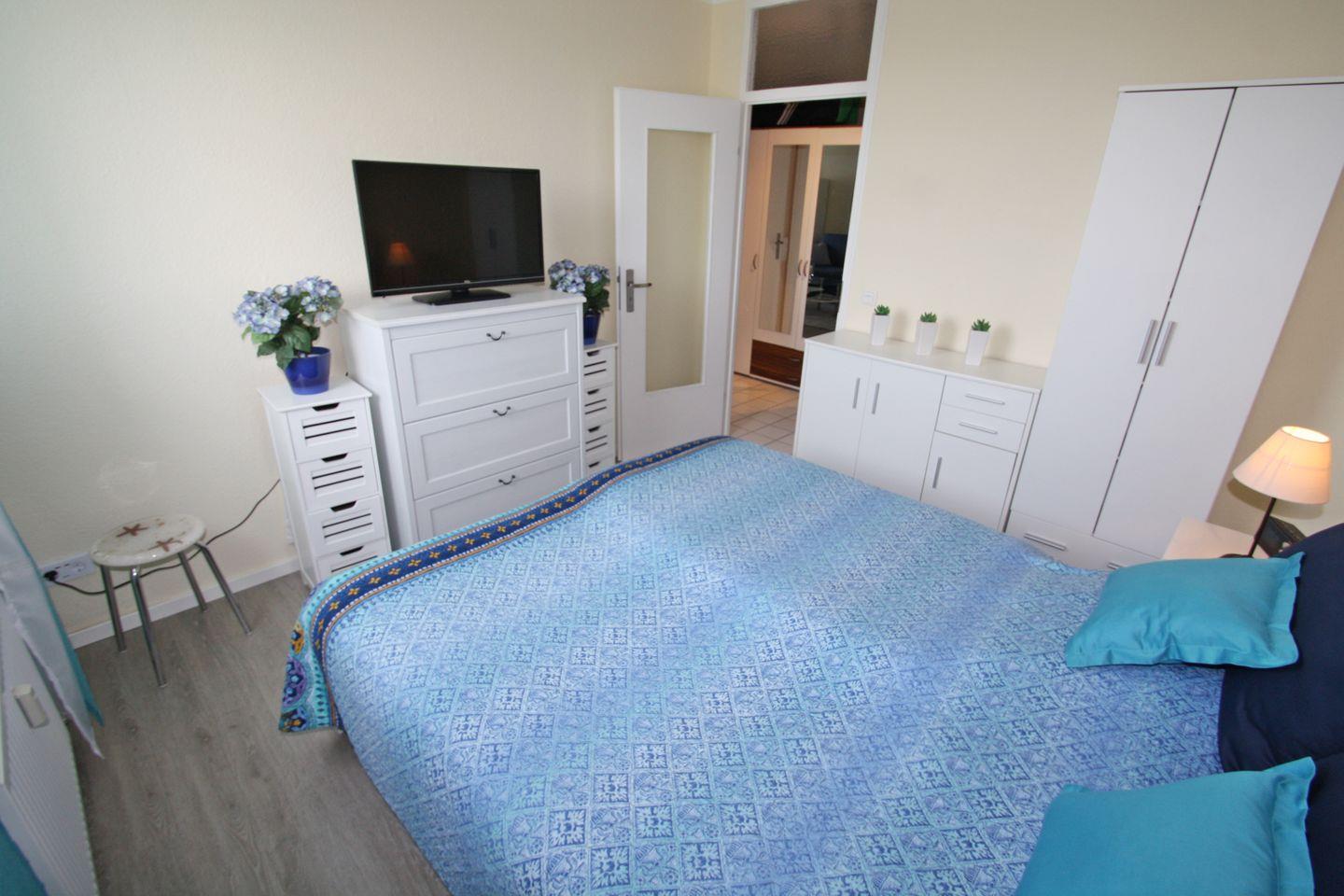 Separates und großes Schlafzimmer mit Doppelbett (zweiteilige Matratze zu je 90 x 200 cm), Kleiderschrank, 2 Nachttischen, 2 Anrichten sowie einem internetfähigen Flachbild-TV (102 cm) und DVD-Player.
