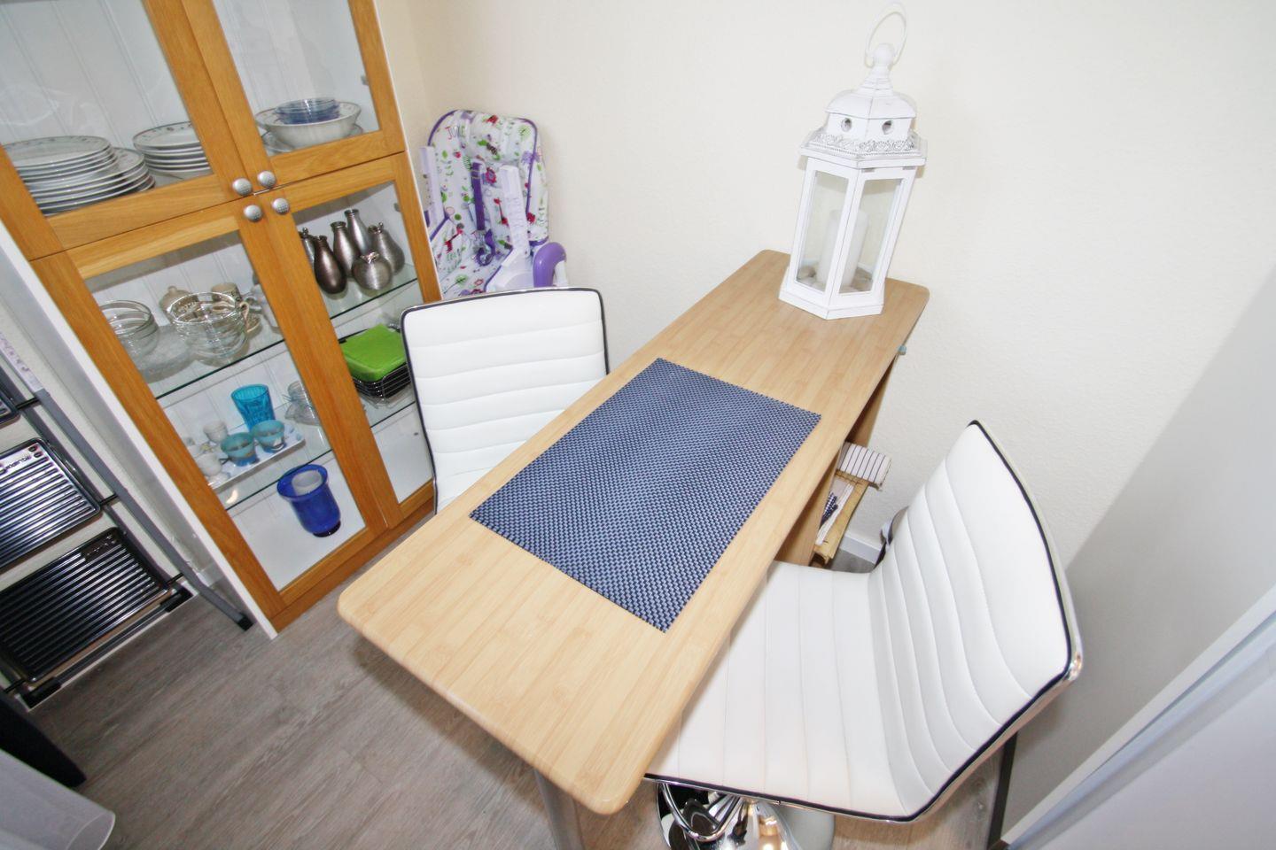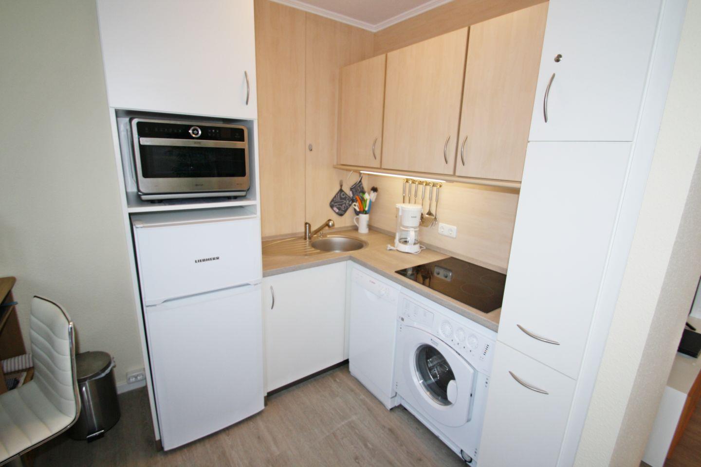 Die geräumige Küche ist ausgestattet mit einem großen Kühlschrank samt extra Gefrierfach, einem 4er Ceranfeld, einem Kombi-Gerät (Mikrowelle & Backofen), Kaffeemaschine, Toaster, Wasserkocher, Stehtisch, sowie einem Geschirrspüler und einer Waschmaschine mit Trocknerfunktion.