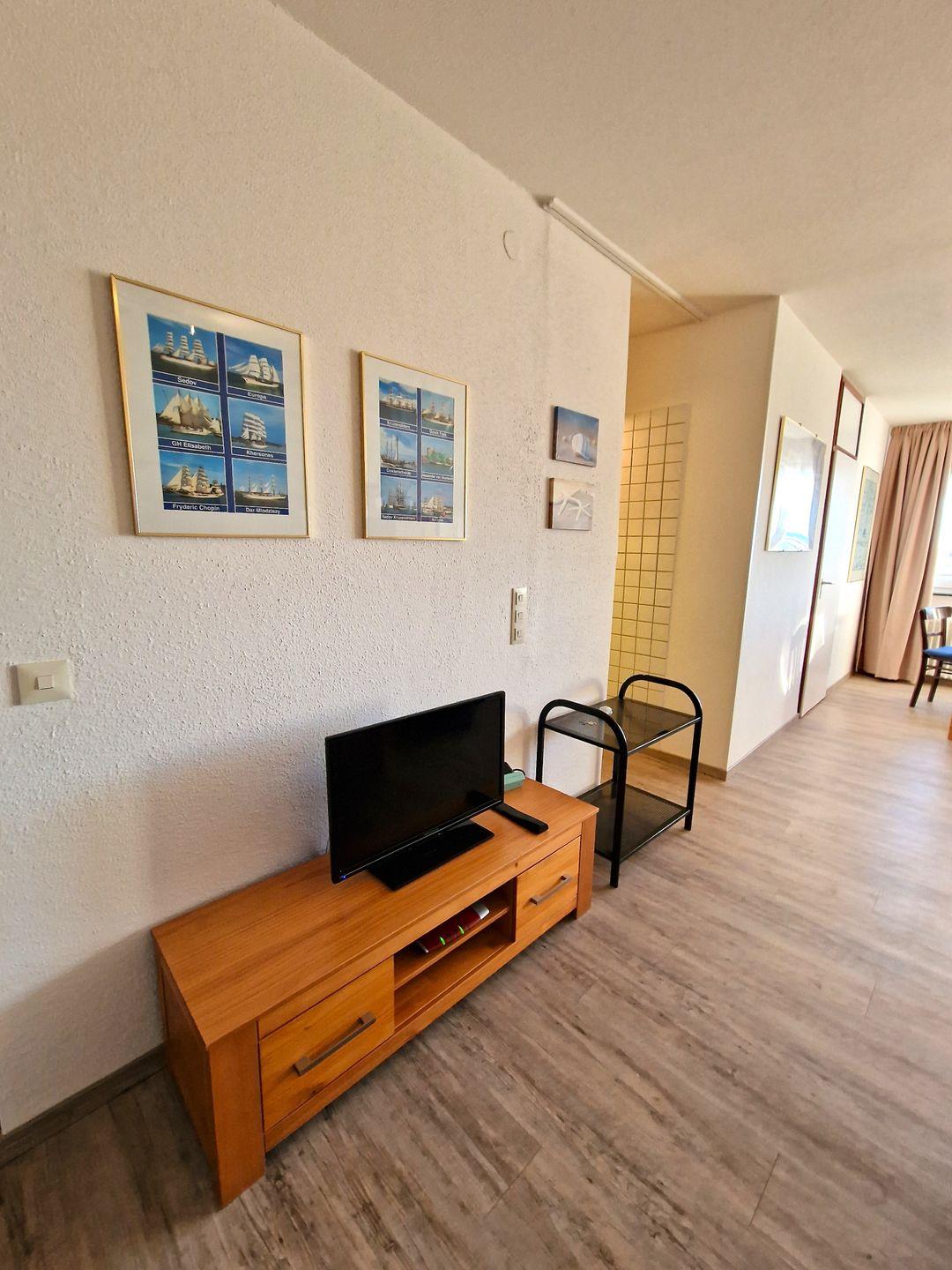 Die Wohnung im 4. Stock ist modern und gemütlich eingerichtet, ideal für Gäste, die zwischen Entspannung und Abenteuer wählen möchten. Genießen Die den Blick über die wunderschöne Landschaft und die Ostsee direkt aus dem Wohnzimmer. Dieses ist nicht nur der zentrale Treffpunkt, sondern auch ein Ort der Gemütlichkeit, ausgestattet mit einem komfortablen Sofa, einem Sessel und einem Fernseher mit Kabelanschluss – perfekt für einige entspannte Filmabende nach einem aufregenden Tag am Strand.