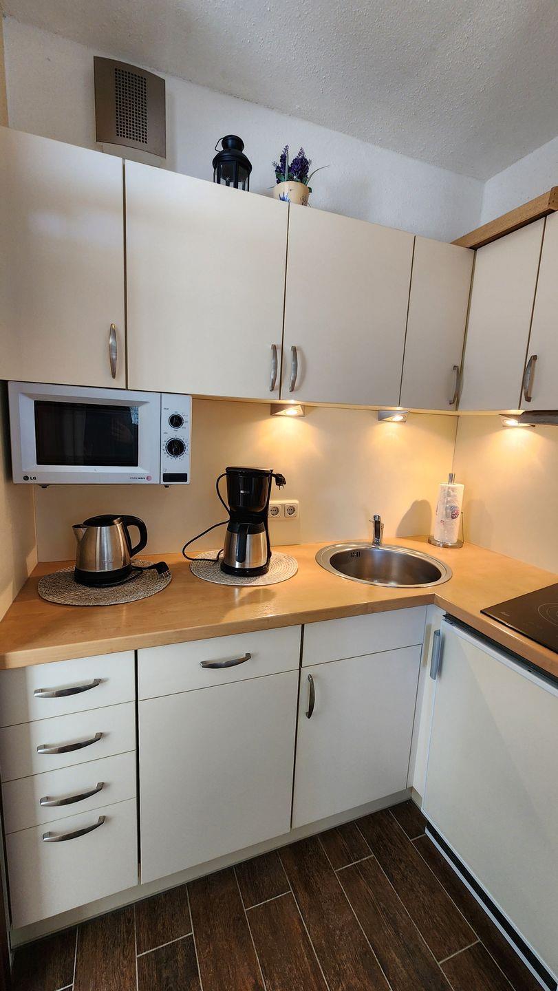 Küche mit 3-Plattenherd, Kaffeemaschine, Geschirrspüler, Mikrowelle und Kühlschrank.
