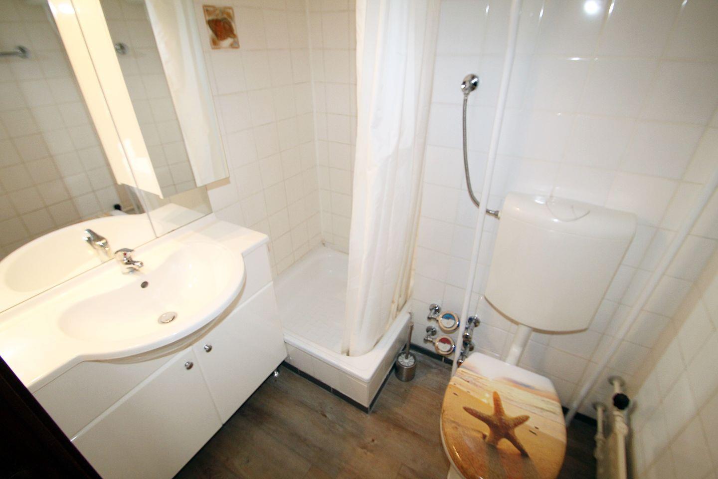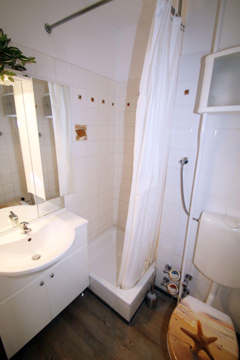 Das Bad mit Dusche und WC sowie einem Spiegelschrank runden die gemütliche Einrichtung ab.