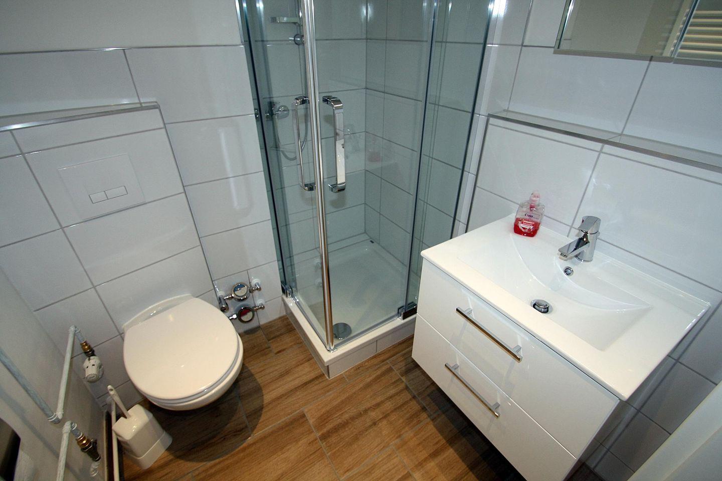 Das schicke Bad verfügt über eine moderne, fast bodentiefe Duschkabine, ein WC sowie einen Handtuchheizkörper.