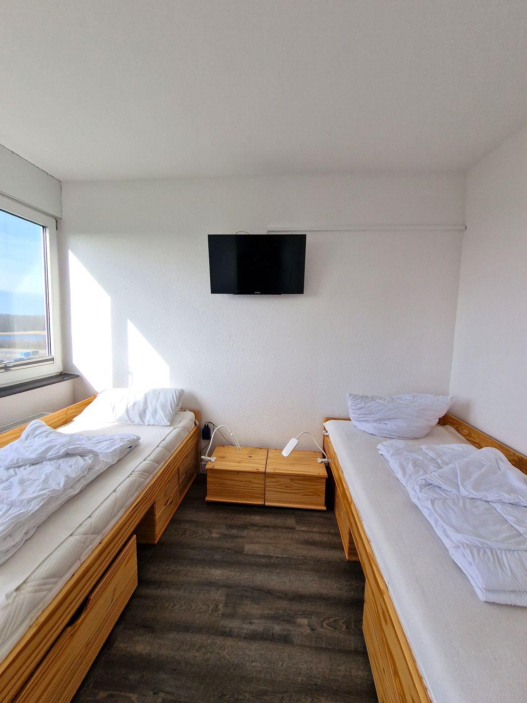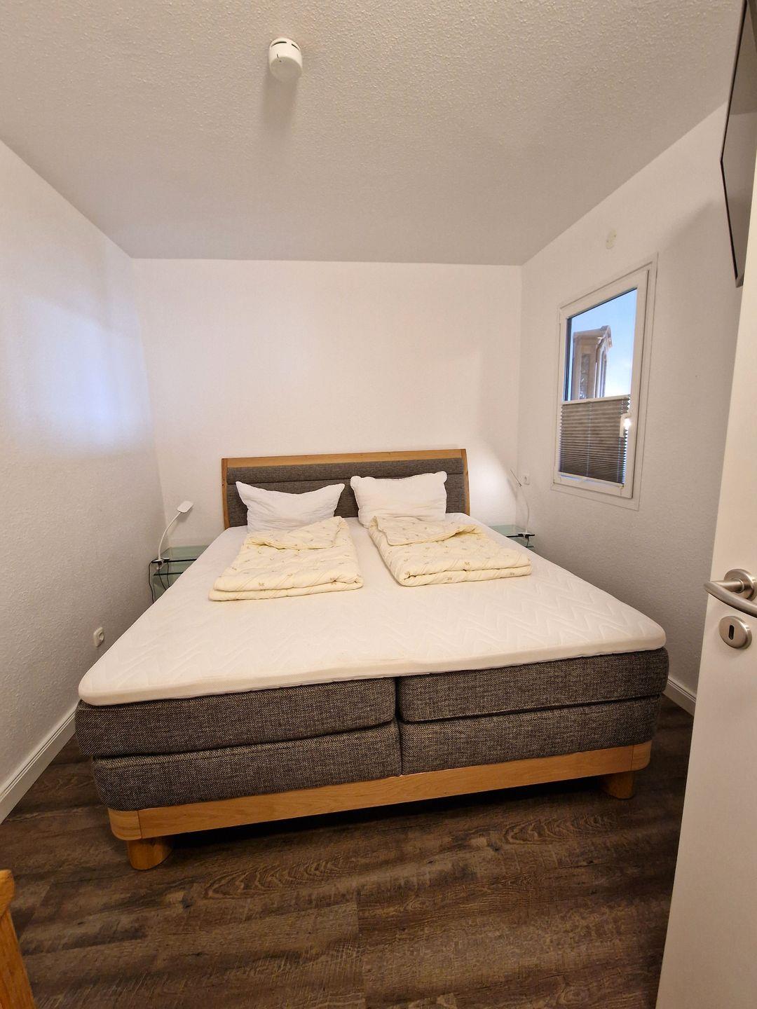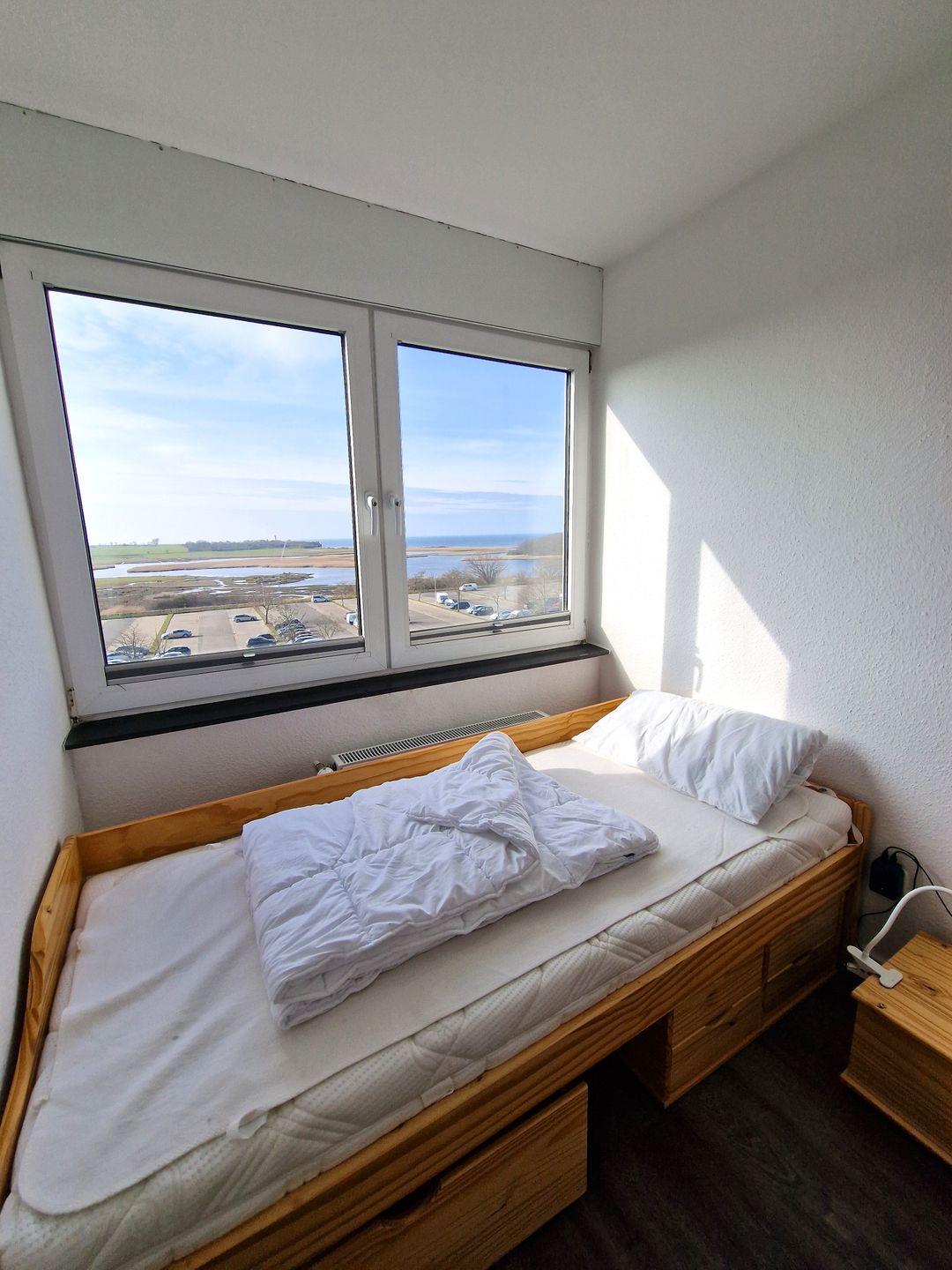 Für einen erholsamen Schlaf sorgen die beiden separaten Schlafzimmer. Das "Eltern"-Schlafzimmer verfügt über ein Doppelbett, eine kleine Kommode und einen kleinen TV. Im "Kinderzimmer" finden natürlich auch Erwachsene in den beiden Einzelbetten ausreichend Schlafkomfort. Hier gibt es eine große Fensterfron mit Blick auf die Salzwiesen und der Ostsee. Und wenn Sie mögen, hilft der kleine TV beim Einschlummern.