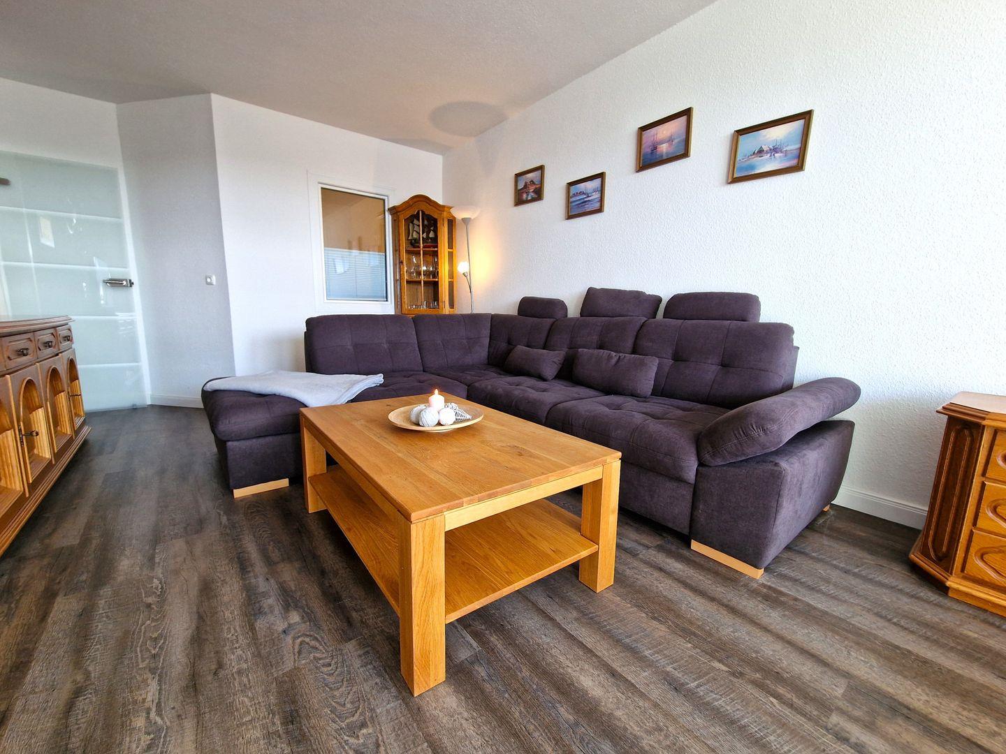 Der Wohnbereich verfügt über eine große Eckcouch und TV. Genießen Sie Ihre Mahlzeiten im integrierten Essbereich mit direktem Blick auf die schönen Salzwiesen und der Ostsee.