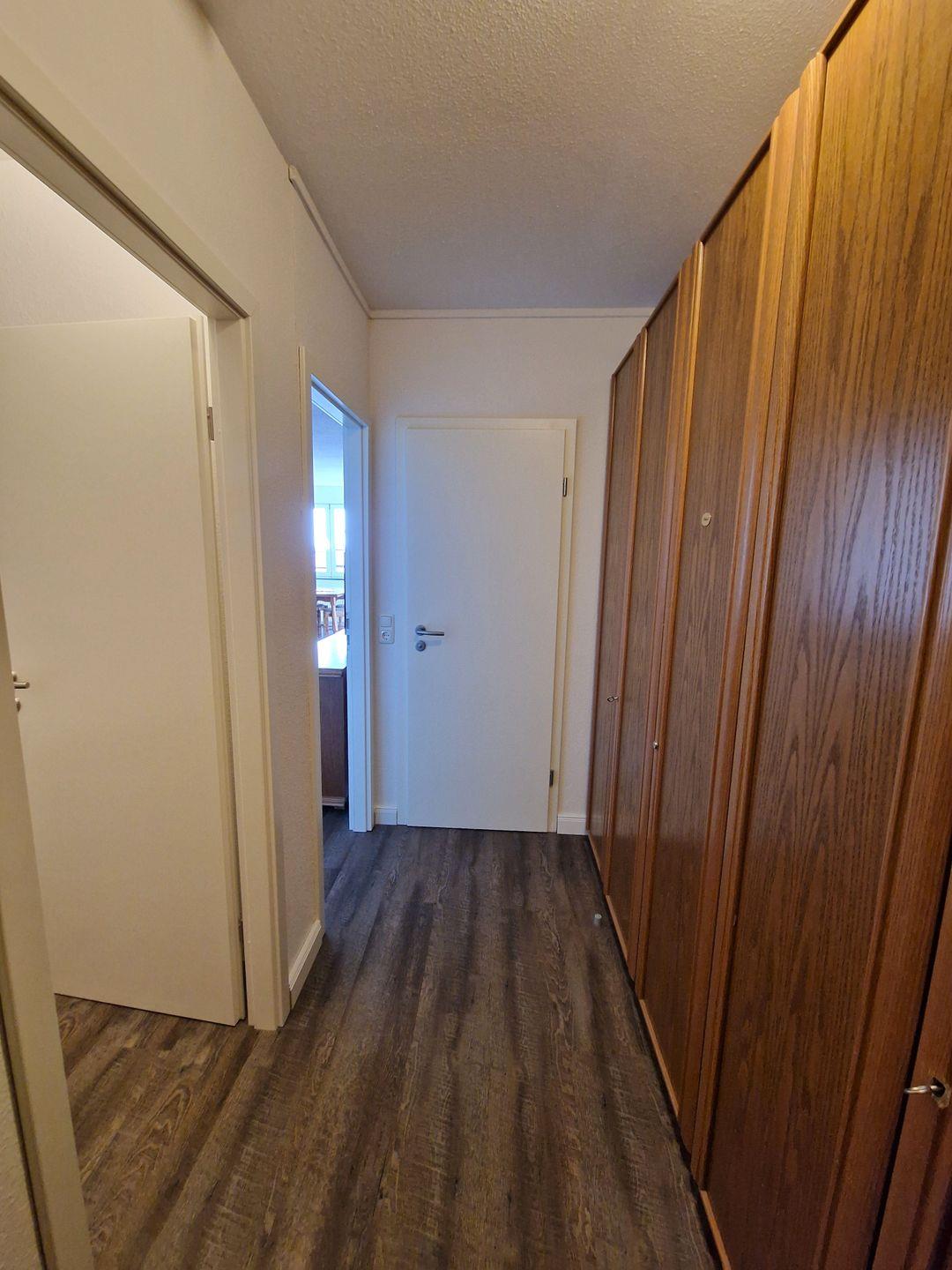 Die gesamte Wohnung ist mit Laminat / PVC ausgelegt. Das Bad verfügt über ein WC und eine Dusche. Im Eingangsbereich findet sich ein großer Schrank für Ihre Bekleidungen.