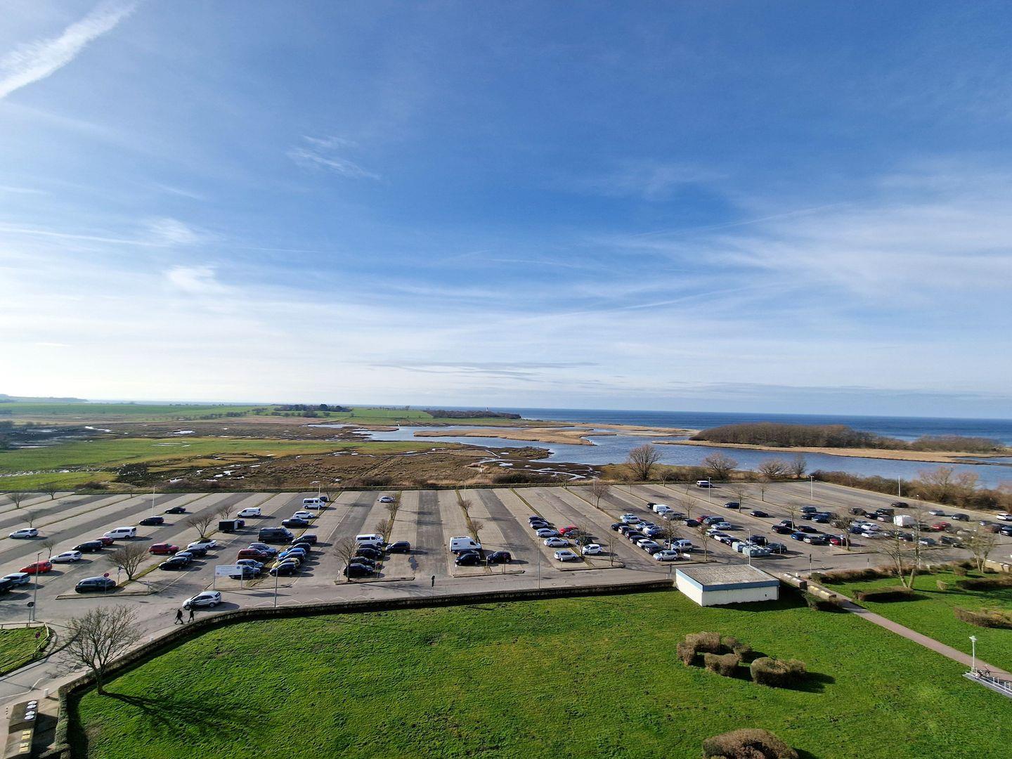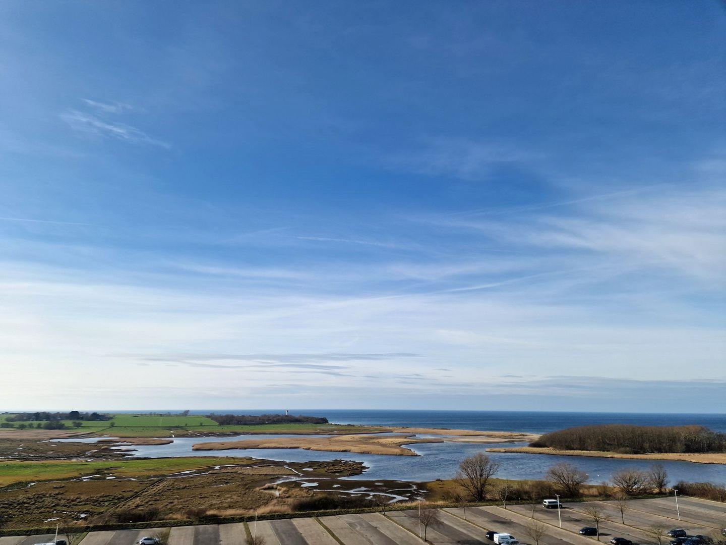 Grenzenlose Aussicht auf Küste, Himmel und Meer! Wie ein Kapitän auf seiner Brücke lassen sich beeindruckende Naturschauspiele und Sonnenuntergänge direkt aus der Ferienwohnung erleben. Völlig unverbaut und ganz bequem im Sitzen (bei Wohnungen im Ferienpark nicht üblich). Beobachten Sie vorne in den geschützten Salzwiesen eine Vielzahl rastender Vögel, die rhythmischen Leuchtsignale auf dem Leuchtturm an der Steilküste, dahinziehende Segler vorne im Wind und am Horizont die Großschifffahrt. (Bitte Fernrohr nicht vergessen!)