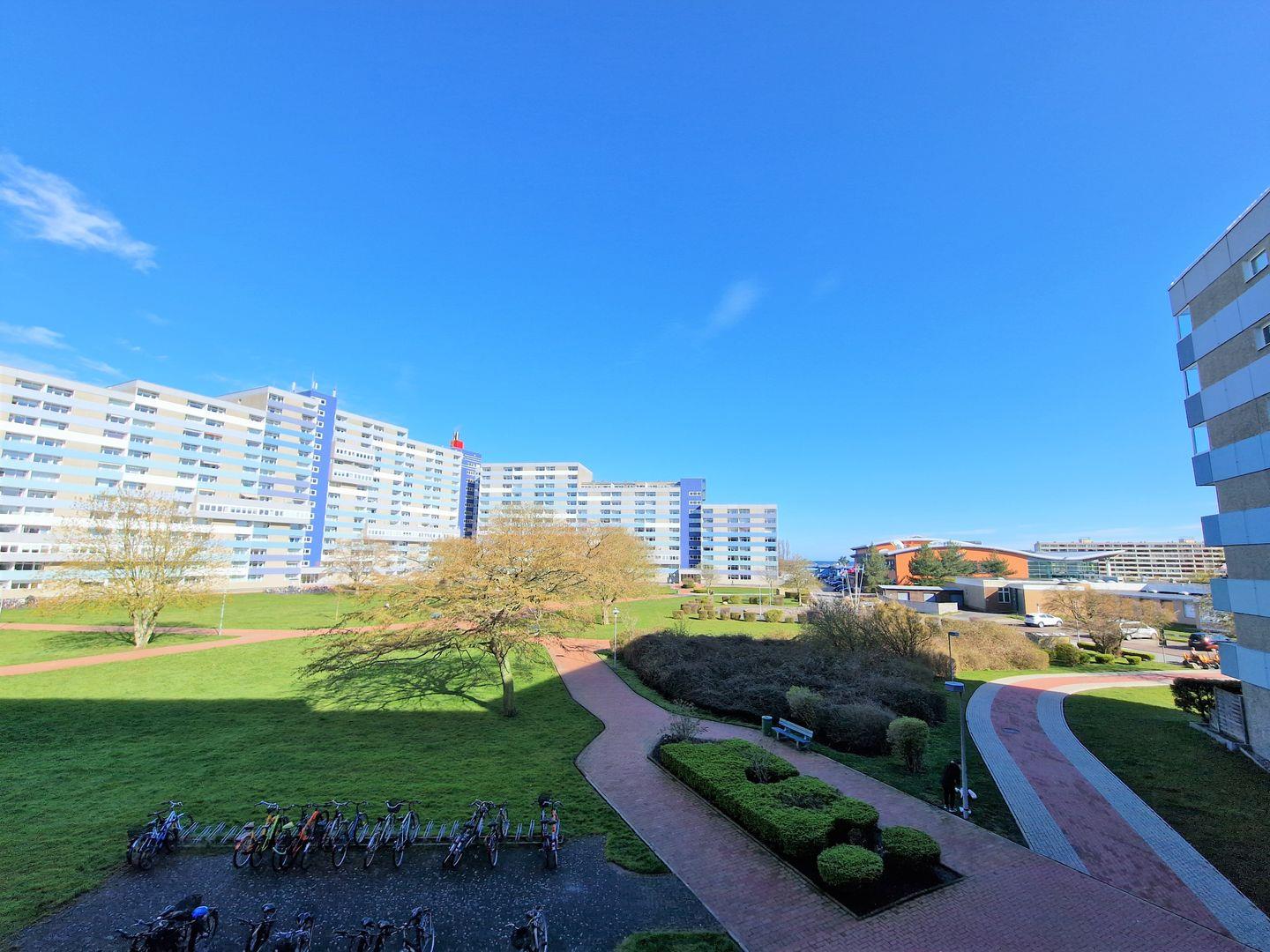 Moderne, helle Ferienwohnung in Heiligenhafen mit Blick auf parkähnlichen Innenhof und bei klarem Wetter bis zur Ostsee.