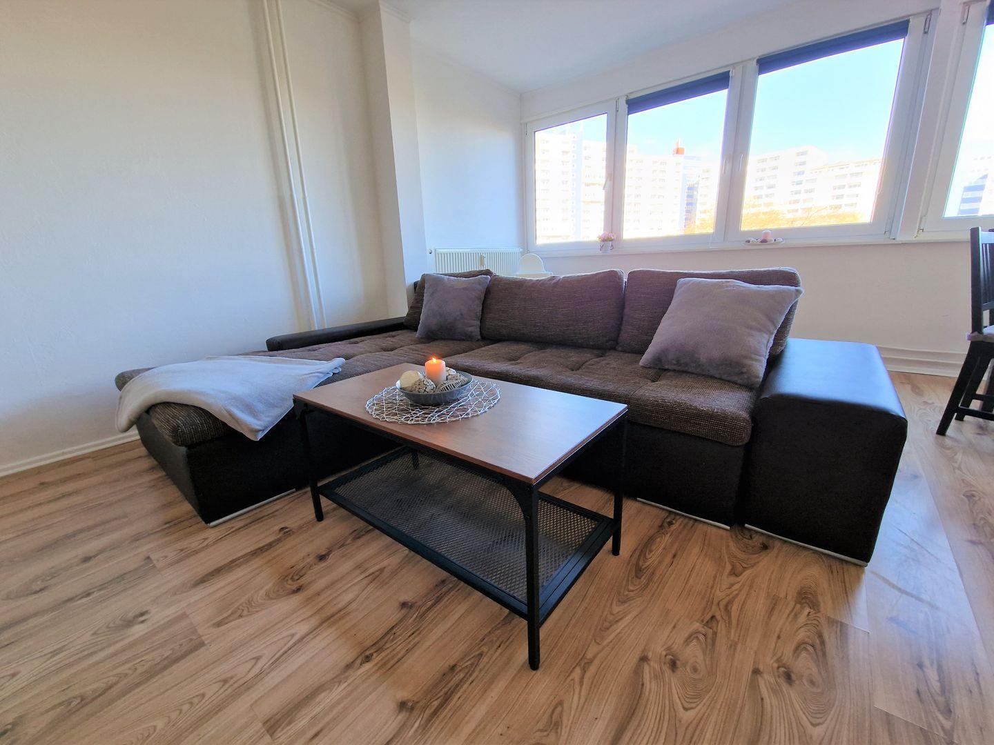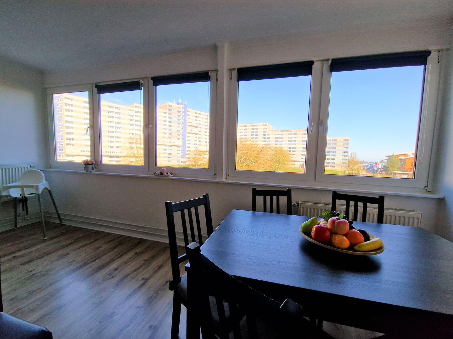 Durch den geräumigen Eingangsbereich der Wohnung erreichen Sie den lichtdurchfluteten Wohnbereich mit offener Küche. Durch die Panoramafenster haben Sie einen direkten Blick in den parkähnlichen Innenhof und können bei klarem Wetter bis zur Ostsee schauen.