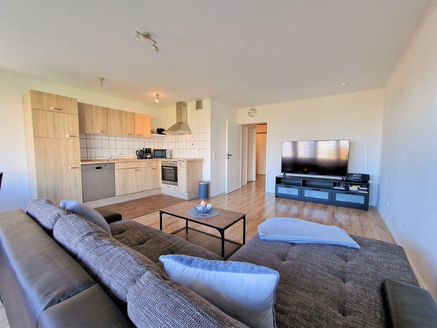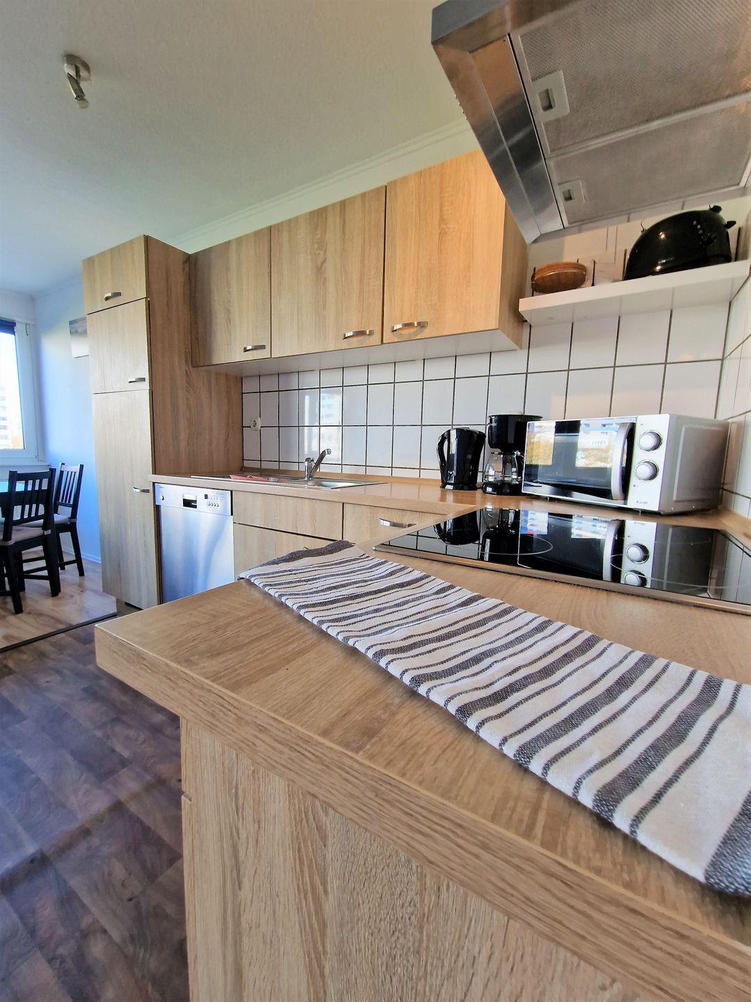 Die offene Küche verfügt über eine moderne Ausstattung. Neben einem Kühlschrank mit Gefrierfach finden Sie hier auch einen Backofen, ein Cerankochfeld, eine Mikrowelle und eine Spülmaschine. Ausreichend Besteck und Geschirr ist ebenfalls vorhanden.