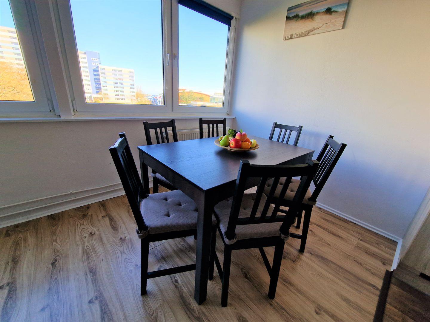 Am Esstisch direkt vor dem Fenster finden bequem bis zu 6 Personen Platz und für unsere kleinen Gäste steht ein Hochstuhl zur Verfügung.