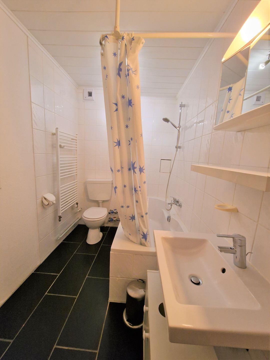 Das Badezimmer verfügt über WC und Badewanne.